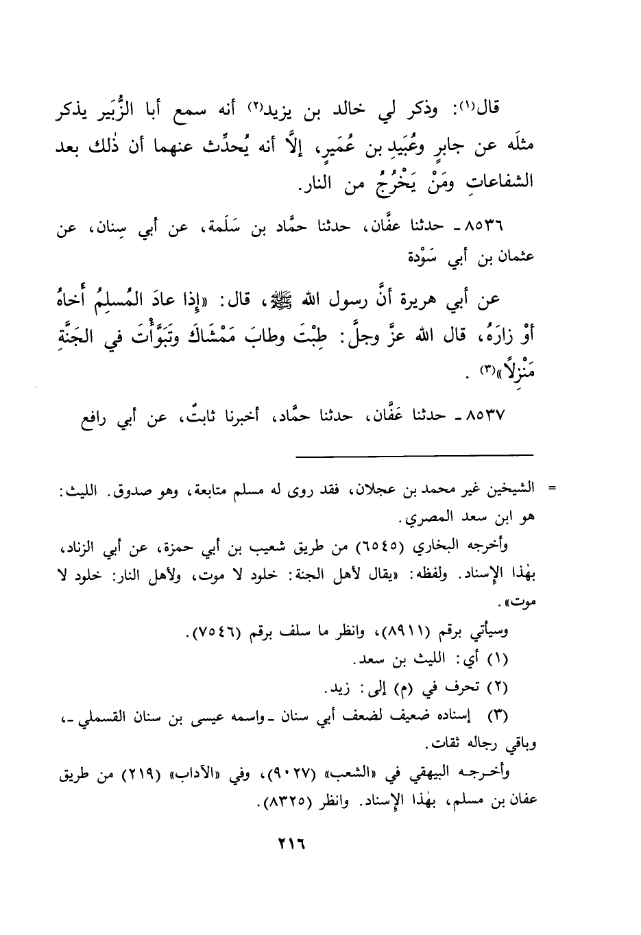 ٨٥٣٦ - حَدَّثَنَا عَفَّانُ، حَدَّثَنَا حَمَّادُ بْنُ سَلَمَةَ، عَنْ أَبِي سِنَانٍ، عَنْ عُثْمَانَ بْنِ أَبِي سَوْدَةَ، عَنْ أَبِي هُرَيْرَةَ، أَنَّ رَسُولَ اللهِ صَلَّى اللهُ عَلَيْهِ وَسَلَّمَ، قَالَ: " إِذَا عَادَ الْمُسْلِمُ أَخَاهُ، أَوْ زَارَهُ، قَالَ اللهُ عَزَّ وَجَلَّ: طِبْتَ وَطَابَ مَمْشَاكَ، وَتَبَوَّأْتَ فِي الْجَنَّةِ مَنْزِلًا " (٣)