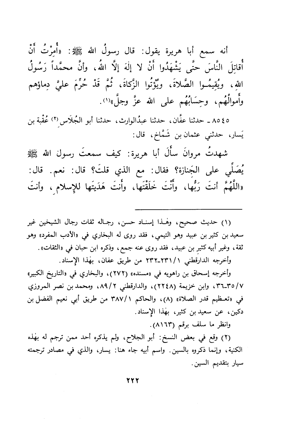 ٨٥٤٥ - حَدَّثَنَا عَفَّانُ، حَدَّثَنَا عَبْدُ الْوَارِثِ، حَدَّثَنَا أَبُو الْجُلَاسِ (٢) عُقْبَةُ بْنُ يَسَارٍ، حَدَّثَنِي عُثْمَانُ بْنُ شَمَّاخٍ، قَالَ: شَهِدْتُ مَرْوَانَ سَأَلَ أَبَا هُرَيْرَةَ، كَيْفَ سَمِعْتَ رَسُولَ اللهِ صَلَّى اللهُ عَلَيْهِ وَسَلَّمَ يُصَلِّي عَلَى الْجِنَازَةِ؟ فَقَالَ: مَعَ الَّذِي قُلْتُ؟ قَالَ: نَعَمْ، قَالَ: " اللهُمَّ أَنْتَ رَبُّهَا، وَأَنْتَ خَلَقْتَهَا، وَأَنْتَ هَدَيْتَهَا لِلْإِسْلَامِ، وَأَنْتَ