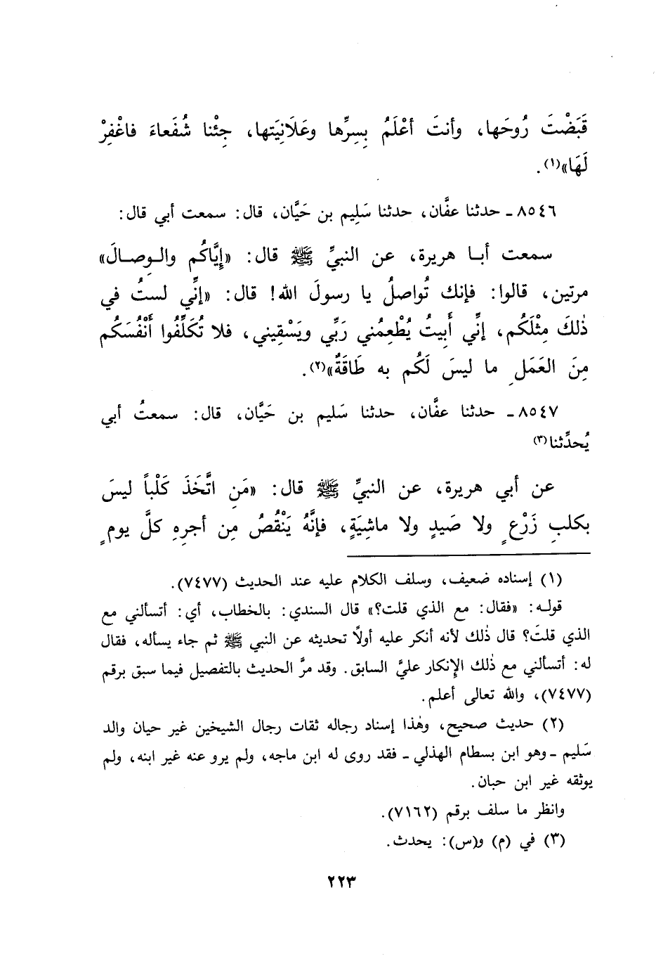 ٨٥٤٧ - حَدَّثَنَا عَفَّانُ، حَدَّثَنَا سَلِيمُ بْنُ حَيَّانَ، قَالَ: سَمِعْتُ أَبِي، يُحَدِّثُنَا (٣) عَنْ أَبِي هُرَيْرَةَ، عَنِ النَّبِيِّ صَلَّى اللهُ عَلَيْهِ وَسَلَّمَ، قَالَ: " مَنِ اتَّخَذَ كَلْبًا، لَيْسَ بِكَلْبِ زَرْعٍ، وَلَا صَيْدٍ، وَلَا مَاشِيَةٍ، فَإِنَّهُ يَنْقُصُ مِنْ أَجْرِهِ كُلَّ يَوْمٍ
