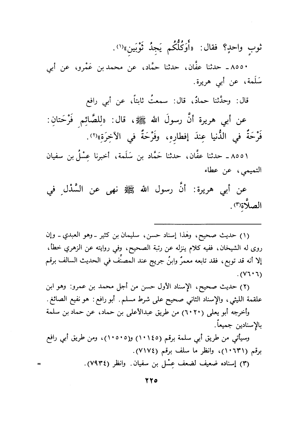 ٨٥٥٠ - حَدَّثَنَا عَفَّانُ، حَدَّثَنَا حَمَّادٌ، عَنْ مُحَمَّدِ بْنِ عَمْرٍو، عَنْ أَبِي سَلَمَةَ، عَنْ أَبِي هُرَيْرَةَ، قَالَ: وحَدَّثَنَا حَمَّادٌ، قَالَ: سَمِعْتُ ثَابِتًا، عَنْ أَبِي رَافِعٍ، عَنْ أَبِي هُرَيْرَةَ، أَنَّ رَسُولَ اللهِ صَلَّى اللهُ عَلَيْهِ وَسَلَّمَ، قَالَ: " لِلصَّائِمِ فَرْحَتَانِ: فَرْحَةٌ فِي الدُّنْيَا عِنْدَ إِفْطَارِهِ، وَفَرْحَةٌ فِي الْآخِرَةِ " (٢)