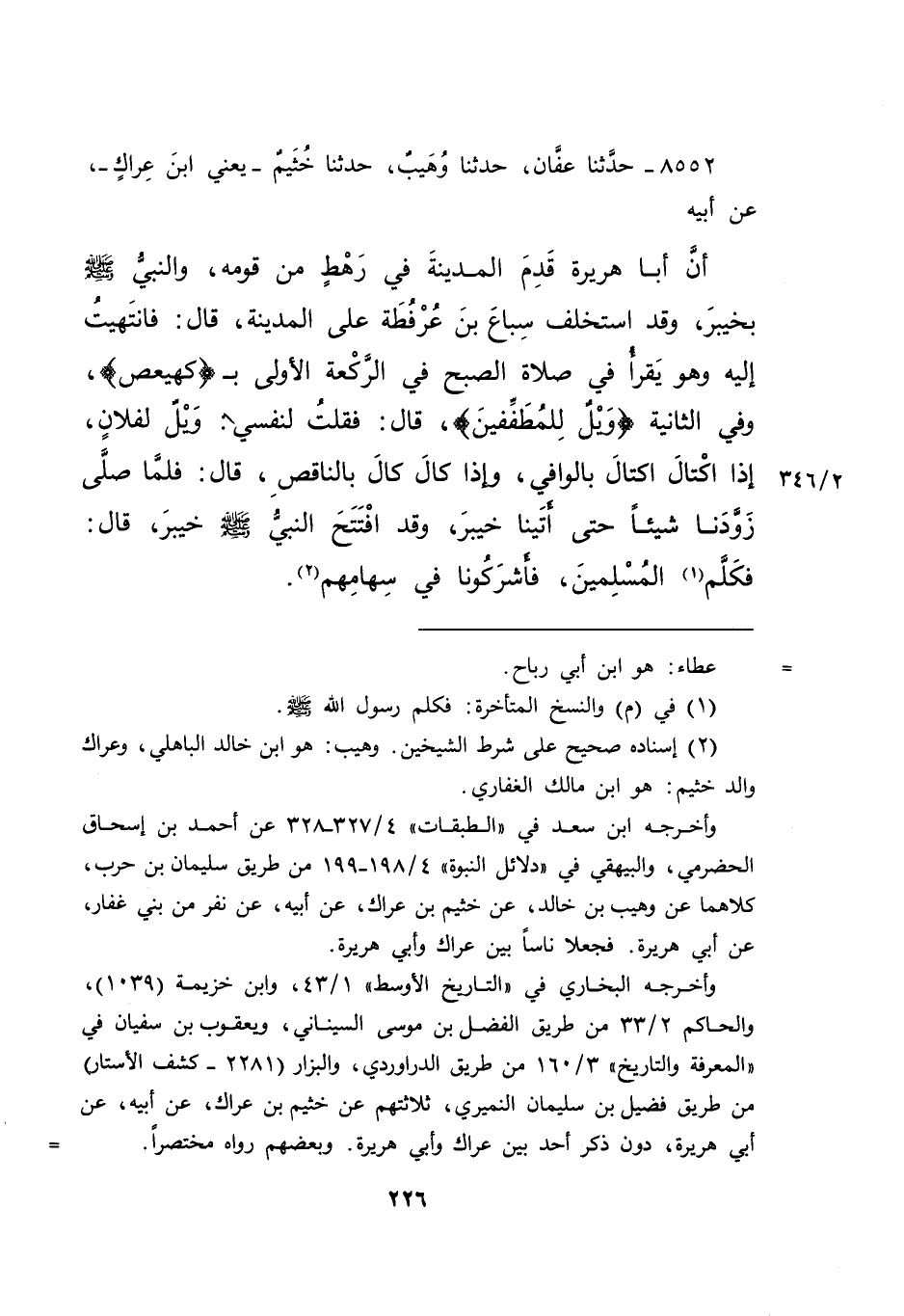 ٨٥٥٢ - حَدَّثَنَا عَفَّانُ، حَدَّثَنَا وُهَيْبٌ، حَدَّثَنَا خُثَيْمٌ يَعْنِي ابْنَ عِرَاكٍ، عَنْ أَبِيهِ، أَنَّ أَبَا هُرَيْرَةَ، قَدِمَ الْمَدِينَةَ فِي رَهْطٍ مِنْ قَوْمِهِ، وَالنَّبِيُّ صَلَّى اللهُ عَلَيْهِ وَسَلَّمَ بِخَيْبَرَ، وَقَدِ اسْتَخْلَفَ سِبَاعَ بْنَ عُرْفُطَةَ عَلَى الْمَدِينَةِ، قَالَ: " فَانْتَهَيْتُ إِلَيْهِ وَهُوَ يَقْرَأُ فِي صَلَاةِ الصُّبْحِ فِي الرَّكْعَةِ الْأُولَى بـ: كهيعص، وَفِي الثَّانِيَةِ: وَيْلٌ لِلْمُطَفِّفِينَ "، قَالَ: فَقُلْتُ لِنَفْسِي: " وَيْلٌ لِفُلَانٍ إِذَا اكْتَالَ اكْتَالَ بِالْوَافِي، وَإِذَا كَالَ كَالَ بِالنَّاقِصِ "، قَالَ: " فَلَمَّا صَلَّى زَوَّدَنَا شَيْئًا حَتَّى أَتَيْنَا خَيْبَرَ، وَقَدِ افْتَتَحَ النَّبِيُّ صَلَّى اللهُ عَلَيْهِ وَسَلَّمَ خَيْبَرَ "، قَالَ: " فَكَلَّمَ (١) الْمُسْلِمِينَ فَأَشْرَكُونَا فِي سِهَامِهِمْ " (٢)