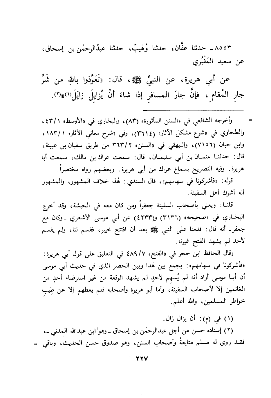 ٨٥٥٣ - حَدَّثَنَا عَفَّانُ، حَدَّثَنَا وُهَيْبٌ، حَدَّثَنَا عَبْدُ الرَّحْمَنِ بْنُ إِسْحَاقَ، عَنْ سَعِيدٍ الْمَقْبُرِيِّ، عَنْ أَبِي هُرَيْرَةَ، عَنِ النَّبِيِّ صَلَّى اللهُ عَلَيْهِ وَسَلَّمَ، قَالَ: " تَعَوَّذُوا بِاللهِ مِنْ شَرِّ جَارِ الْمَقَامِ، فَإِنَّ جَارَ الْمُسَافِرِ إِذَا شَاءَ أَنْ يُزَايِلَ زَايَلَ (١) " (٢)