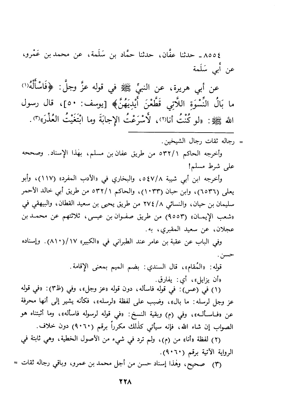 ٨٥٥٤ - حَدَّثَنَا عَفَّانُ، حَدَّثَنَا حَمَّادُ بْنُ سَلَمَةَ، عَنْ مُحَمَّدِ بْنِ عَمْرٍو، عَنْ أَبِي سَلَمَةَ، عَنْ أَبِي هُرَيْرَةَ، عَنِ النَّبِيِّ صَلَّى اللهُ عَلَيْهِ وَسَلَّمَ فِي قَوْلِهِ عَزَّ وَجَلَّ: {فَاسْأَلْهُ (١) مَا بَالُ النِّسْوَةِ اللَّاتِي قَطَّعْنَ أَيْدِيَهُنَّ} [يوسف: ٥٠] ، قَالَ رَسُولُ اللهِ صَلَّى اللهُ عَلَيْهِ وَسَلَّمَ: " لَوْ كُنْتُ أَنَا (٢) لَأَسْرَعْتُ الْإِجَابَةَ، وَمَا ابْتَغَيْتُ الْعُذْرَ " (٣)