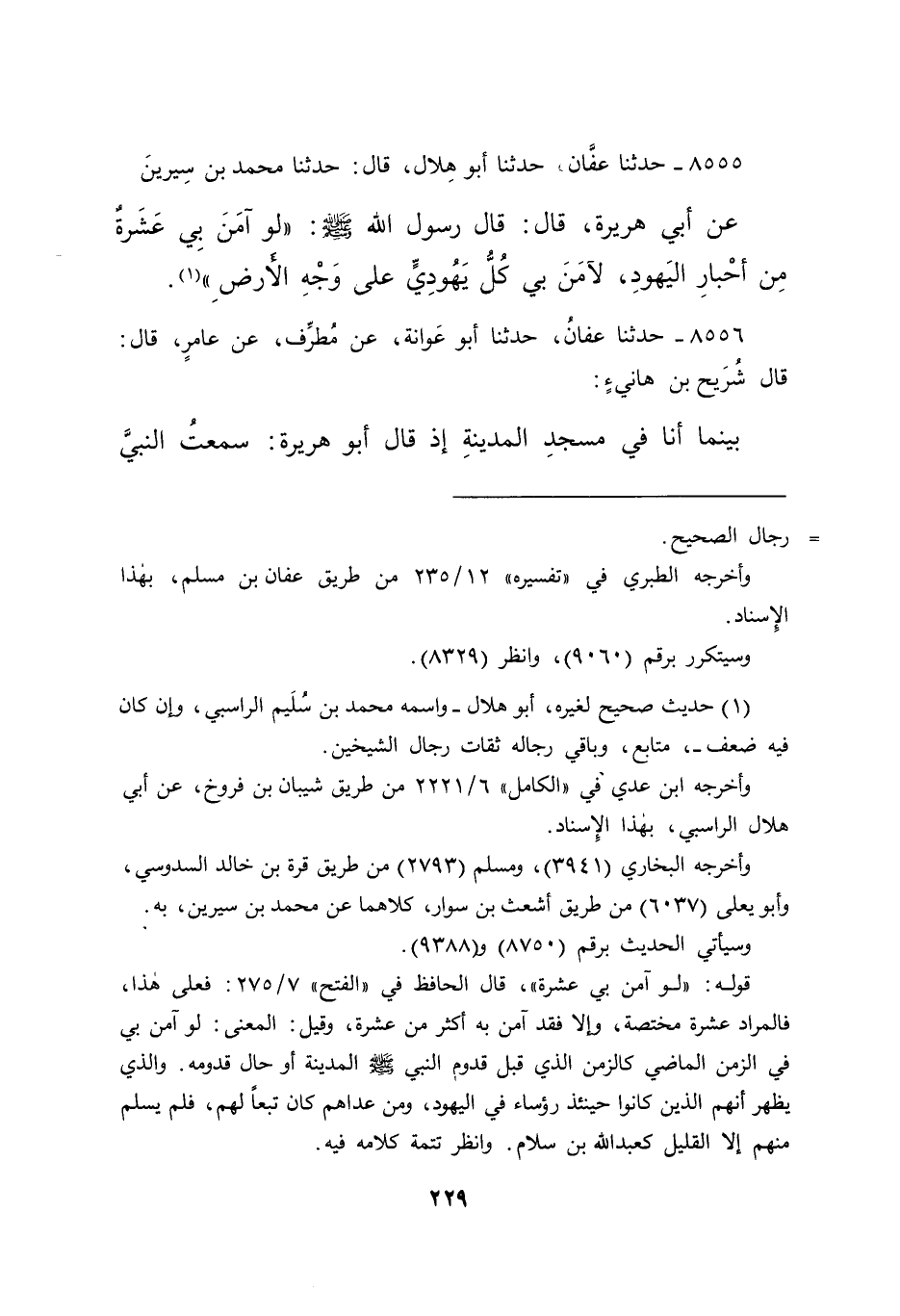 ٨٥٥٥ - حَدَّثَنَا عَفَّانُ، حَدَّثَنَا أَبُو هِلَالٍ، قَالَ: حَدَّثَنَا مُحَمَّدُ بْنُ سِيرِينَ، عَنْ أَبِي هُرَيْرَةَ، قَالَ: قَالَ رَسُولُ اللهِ صَلَّى اللهُ عَلَيْهِ وَسَلَّمَ: " لَوْ آمَنَ بِي عَشْرَةٌ مِنْ أَحْبَارِ الْيَهُودِ، لَآمَنَ بِي كُلُّ يَهُودِيٍّ عَلَى وَجْهِ الْأَرْضِ " (١)