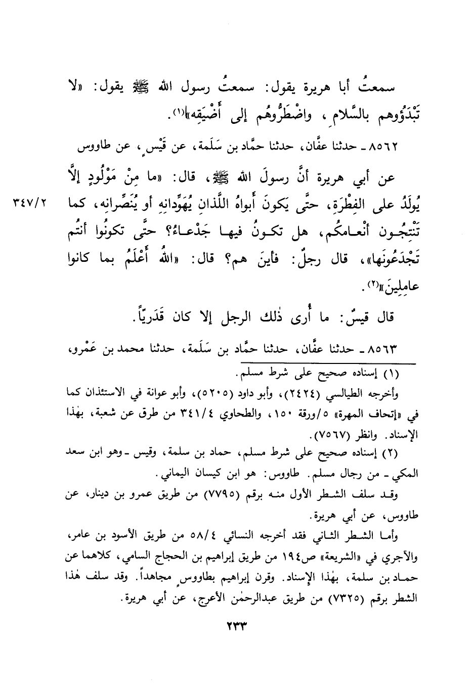 ٨٥٦٢ - حَدَّثَنَا عَفَّانُ، حَدَّثَنَا حَمَّادُ بْنُ سَلَمَةَ، عَنْ قَيْسٍ، عَنْ طَاوُسٍ، عَنْ أَبِي هُرَيْرَةَ، أَنَّ رَسُولَ اللهِ صَلَّى اللهُ عَلَيْهِ وَسَلَّمَ، قَالَ: " مَا مِنْ مَوْلُودٍ إِلَّا يُولَدُ عَلَى الْفِطْرَةِ، حَتَّى يَكُونَ أَبَوَاهُ اللَّذَانِ يُهَوِّدَانِهِ، أَوْ يُنَصِّرَانِهِ كَمَا تُنْتِجُونَ أَنْعَامَكُمْ، هَلْ تَكُونُ فِيهَا جَدْعَاءُ حَتَّى تَكُونُوا أَنْتُمْ تَجْدَعُونَهَا؟ " قَالَ رَجُلٌ: فَأَيْنَ هُمْ؟ قَالَ: " اللهُ أَعْلَمُ بِمَا كَانُوا عَامِلِينَ " (٢) قَالَ قَيْسٌ: " مَا أَرَى ذَلِكَ الرَّجُلَ إِلَّا كَانَ قَدَرِيًّا "