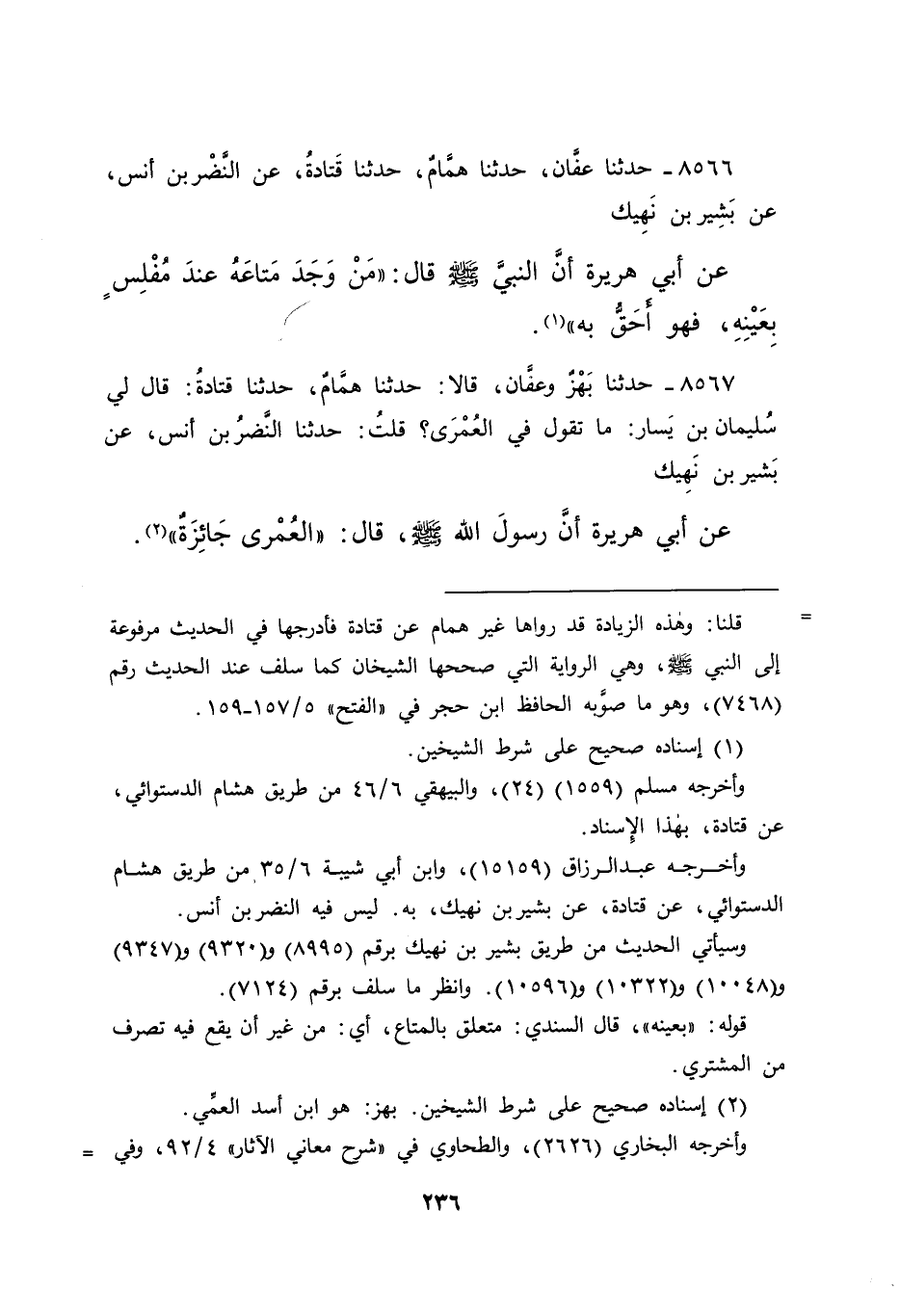 ٨٥٦٦ - حَدَّثَنَا عَفَّانُ، حَدَّثَنَا هَمَّامٌ، حَدَّثَنَا قَتَادَةُ، عَنِ النَّضْرِ بْنِ أَنَسٍ، عَنْ بَشِيرِ بْنِ نَهِيكٍ، عَنْ أَبِي هُرَيْرَةَ، أَنَّ النَّبِيَّ صَلَّى اللهُ عَلَيْهِ وَسَلَّمَ، قَالَ: " مَنْ وَجَدَ مَتَاعَهُ عِنْدَ مُفْلِسٍ بِعَيْنِهِ، فَهُوَ أَحَقُّ بِهِ " (١)
