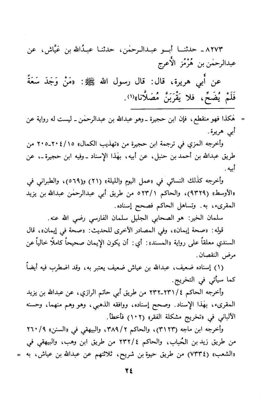 ٨٢٧٣ - حَدَّثَنَا أَبُو عَبْدِ الرَّحْمَنِ، حَدَّثَنَا عَبْدُ اللهِ بْنُ عَيَّاشٍ، عَنْ عَبْدِ الرَّحْمَنِ بْنِ هُرْمُزَ الْأَعْرَجِ، عَنْ أَبِي هُرَيْرَةَ، قَالَ: قَالَ رَسُولُ اللهِ صَلَّى اللهُ عَلَيْهِ وَسَلَّمَ: " مَنْ وَجَدَ سَعَةً فَلَمْ يُضَحِّ، فَلَا يَقْرَبَنَّ مُصَلَّانَا " (١)