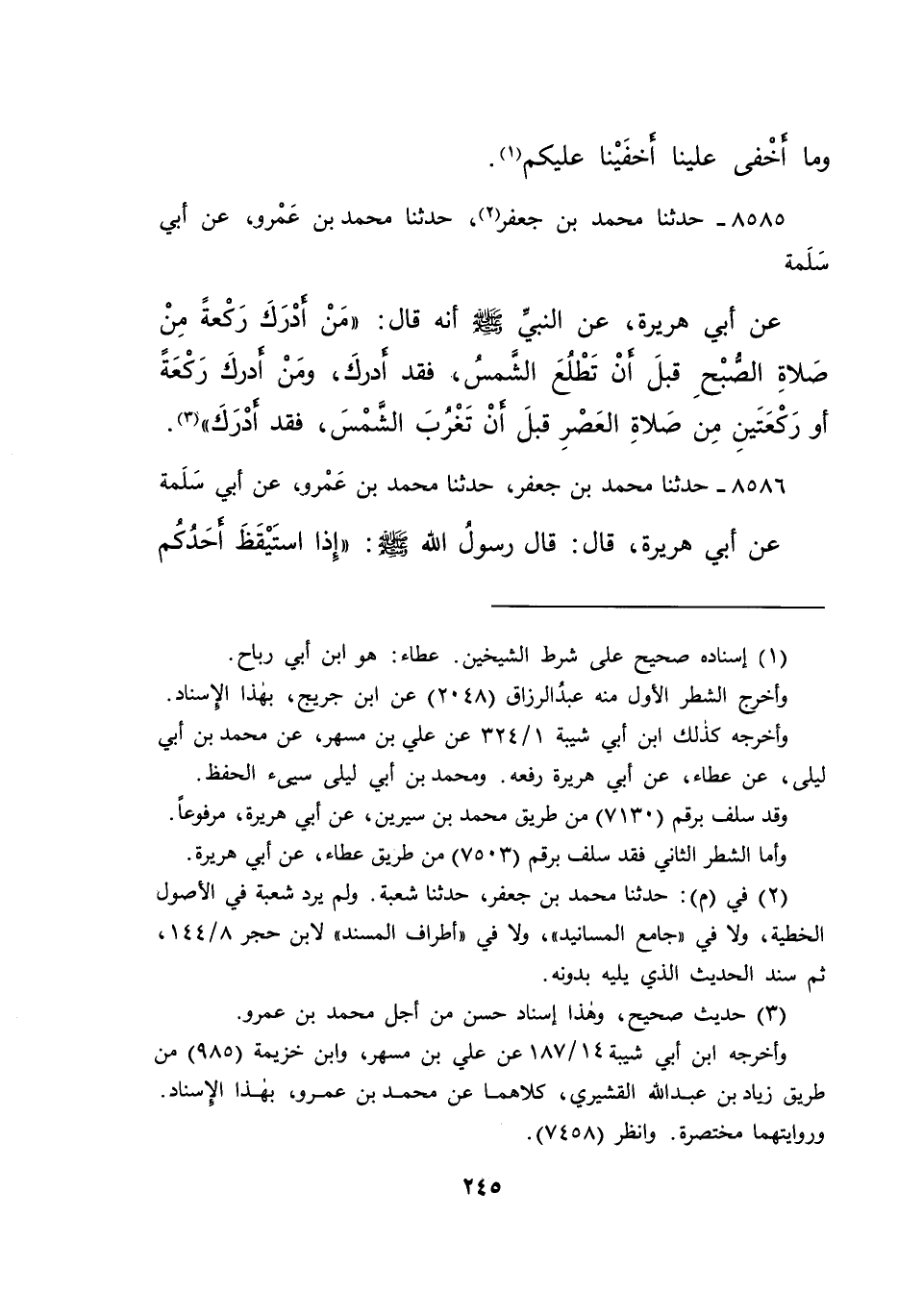 ٨٥٨٥ - حَدَّثَنَا مُحَمَّدُ بْنُ جَعْفَرٍ (٢) ، حَدَّثَنَا مُحَمَّدُ بْنُ عَمْرٍو، عَنْ أَبِي سَلَمَةَ، عَنْ أَبِي هُرَيْرَةَ، عَنِ النَّبِيِّ صَلَّى اللهُ عَلَيْهِ وَسَلَّمَ أَنَّهُ قَالَ: " مَنْ أَدْرَكَ رَكْعَةً مِنْ صَلَاةِ الصُّبْحِ قَبْلَ أَنْ تَطْلُعَ الشَّمْسُ، فَقَدْ أَدْرَكَ، وَمَنْ أَدْرَكَ رَكْعَةً أَوْ رَكْعَتَيْنِ مِنْ صَلَاةِ الْعَصْرِ قَبْلَ أَنْ تَغْرُبَ الشَّمْسُ، فَقَدْ أَدْرَكَ " (٣)