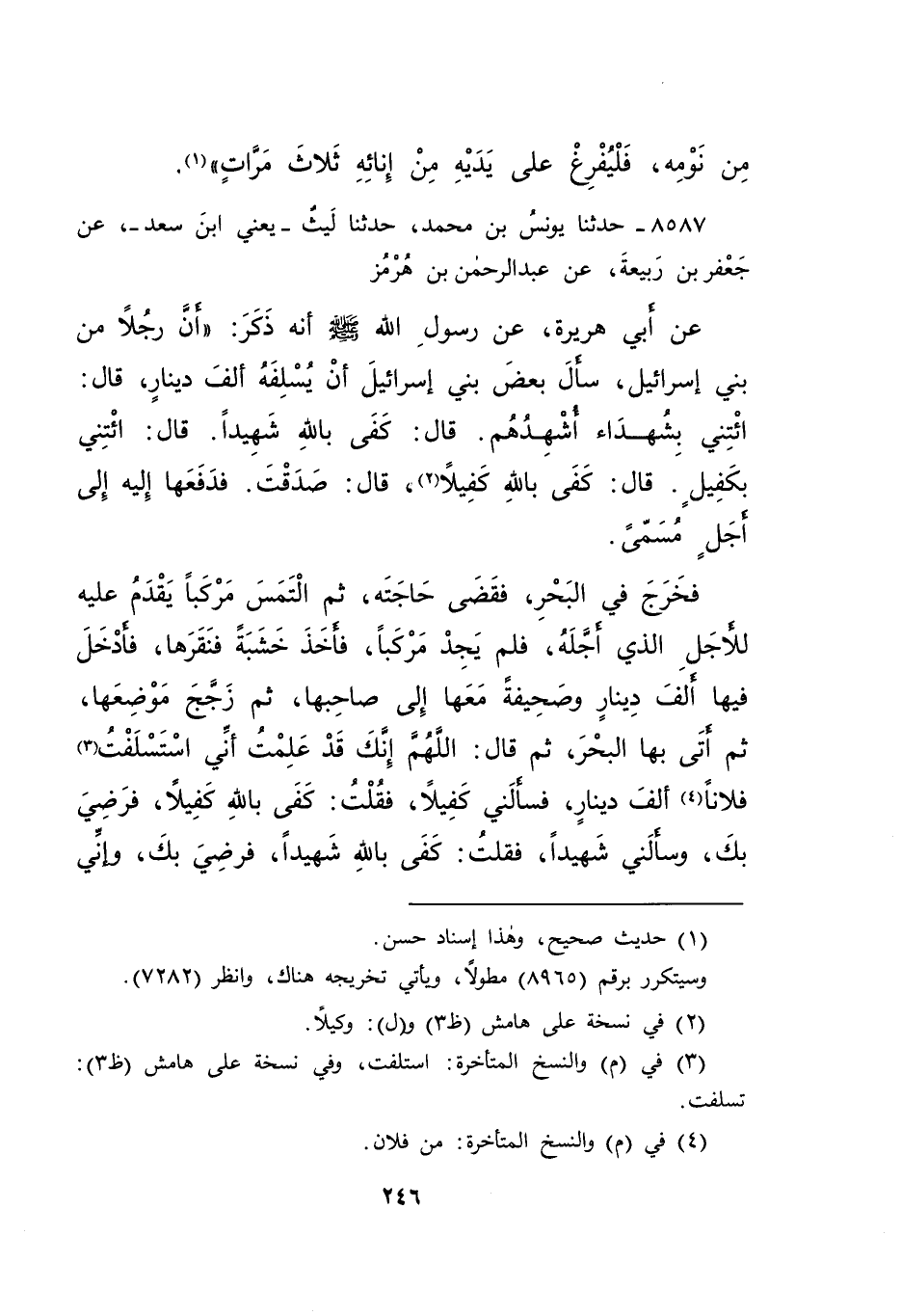 ٨٥٨٧ - حَدَّثَنَا يُونُسُ بْنُ مُحَمَّدٍ، حَدَّثَنَا لَيْثٌ يَعْنِي ابْنَ سَعْدٍ، عَنْ جَعْفَرِ بْنِ رَبِيعَةَ، عَنْ عَبْدِ الرَّحْمَنِ بْنِ هُرْمُزَ، عَنْ أَبِي هُرَيْرَةَ، عَنْ رَسُولِ اللهِ صَلَّى اللهُ عَلَيْهِ وَسَلَّمَ، أَنَّهُ ذَكَرَ: " أَنَّ رَجُلًا مِنْ بَنِي إِسْرَائِيلَ سَأَلَ بَعْضَ بَنِي إِسْرَائِيلَ أَنْ يُسَلِّفَهُ أَلْفَ دِينَارٍ، قَالَ: ائْتِنِي بِشُهَدَاءَ أُشْهِدُهُمْ، قَالَ: كَفَى بِاللهِ شَهِيدًا، قَالَ: ائْتِنِي بِكَفِيلٍ، قَالَ: كَفَى بِاللهِ كَفِيلًا (٢) ، قَالَ: صَدَقْتَ، فَدَفَعَهَا إِلَيْهِ إِلَى أَجَلٍ مُسَمًّى، فَخَرَجَ فِي الْبَحْرِ فَقَضَى حَاجَتَهُ، ثُمَّ الْتَمَسَ مَرْكَبًا، يَقْدَمُ عَلَيْهِ لِلْأَجَلِ الَّذِي أَجَّلَهُ، فَلَمْ يَجِدْ مَرْكَبًا، فَأَخَذَ خَشَبَةً فَنَقَرَهَا، فَأَدْخَلَ فِيهَا أَلْفَ دِينَارٍ، وَصَحِيفَةً مَعَهَا إِلَى صَاحِبِهَا، ثُمَّ زَجَّجَ مَوْضِعَهَا، ثُمَّ أَتَى بِهَا الْبَحْرَ، ثُمَّ قَالَ: اللهُمَّ إِنَّكَ قَدْ عَلِمْتَ أَنِّي اسْتَسْلَفْتُ (٣) فُلَانًا (٤) أَلْفَ دِينَارٍ، فَسَأَلَنِي كَفِيلًا، فَقُلْتُ: كَفَى بِاللهِ كَفِيلًا، فَرَضِيَ بِكَ، وَسَأَلَنِي شَهِيدًا، فَقُلْتُ: كَفَى بِاللهِ شَهِيدًا، فَرَضِيَ بِكَ، وَإِنِّي