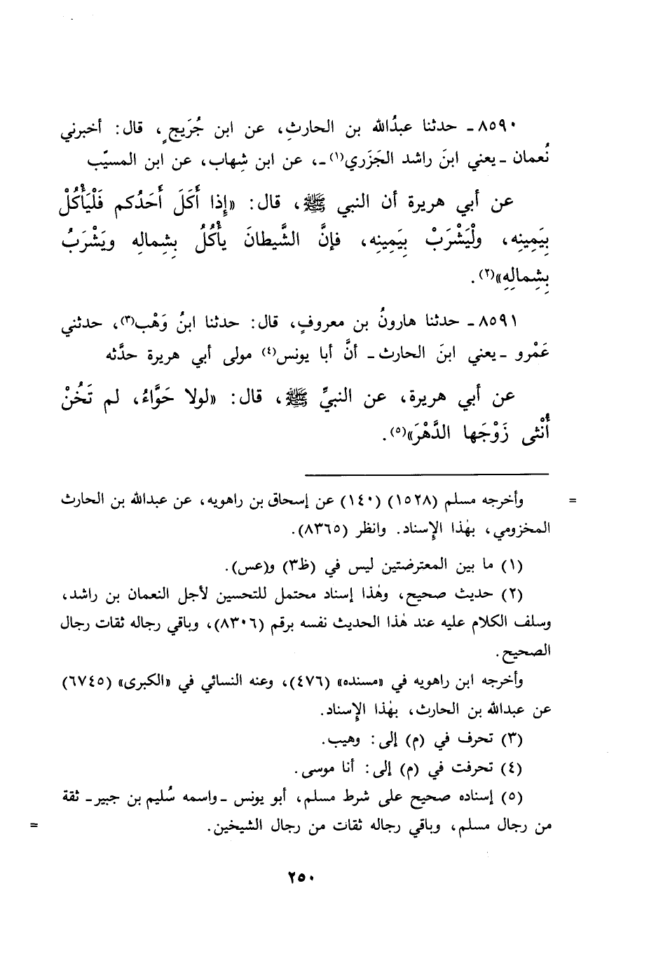 ٨٥٩٠ - حَدَّثَنَا عَبْدُ اللهِ بْنُ الْحَارِثِ، عَنِ ابْنِ جُرَيْجٍ، قَالَ: أَخْبَرَنِي نُعْمَانُ يَعْنِي ابْنَ رَاشِدٍ الْجَزَرِيَّ (١) ، عَنِ ابْنِ شِهَابٍ، عَنِ ابْنِ الْمُسَيِّبِ، عَنْ أَبِي هُرَيْرَةَ، أَنَّ النَّبِيَّ صَلَّى اللهُ عَلَيْهِ وَسَلَّمَ، قَالَ: " إِذَا أَكَلَ أَحَدُكُمْ فَلْيَأْكُلْ بِيَمِينِهِ، وَلْيَشْرَبْ بِيَمِينِهِ، فَإِنَّ الشَّيْطَانَ يَأْكُلُ بِشِمَالِهِ، وَيَشْرَبُ بِشِمَالِهِ " (٢)