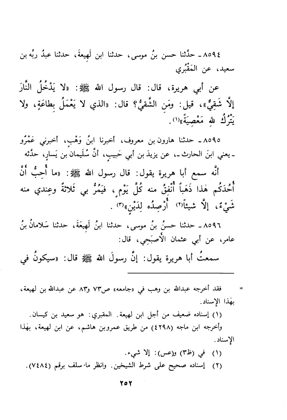٨٥٩٤ - حَدَّثَنَا حَسَنُ بْنُ مُوسَى، حَدَّثَنَا ابْنُ لَهِيعَةَ، حَدَّثَنَا عَبْدُ رَبِّهِ بْنُ سَعِيدٍ، عَنِ الْمَقْبُرِيِّ، عَنْ أَبِي هُرَيْرَةَ، قَالَ: قَالَ رَسُولُ اللهِ صَلَّى اللهُ عَلَيْهِ وَسَلَّمَ: " لَا يَدْخُلُ النَّارَ إِلَّا شَقِيٌّ "، قِيلَ: وَمَنِ الشَّقِيُّ؟ قَالَ: " الَّذِي لَا يَعْمَلُ بِطَاعَةٍ، وَلَا يَتْرُكُ لِلَّهِ مَعْصِيَةً " (١)