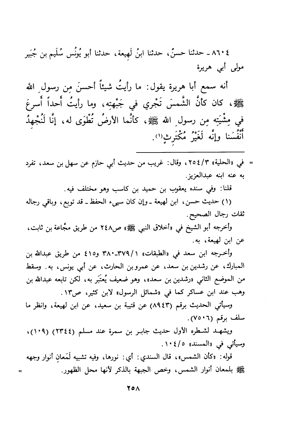٨٦٠٤ - حَدَّثَنَا حَسَنٌ، حَدَّثَنَا ابْنُ لَهِيعَةَ، حَدَّثَنَا أَبُو يُونُسَ سُلَيْمُ بْنُ جُبَيْرٍ، مَوْلَى أَبِي هُرَيْرَةَ، أَنَّهُ سَمِعَ أَبَا هُرَيْرَةَ، يَقُولُ: " مَا رَأَيْتُ شَيْئًا أَحْسَنَ مِنْ رَسُولِ اللهِ صَلَّى اللهُ عَلَيْهِ وَسَلَّمَ، كَانَ كَأَنَّ الشَّمْسَ تَجْرِي فِي جَبْهَتِهِ، وَمَا رَأَيْتُ أَحَدًا أَسْرَعَ فِي مِشْيَتِهِ مِنْ رَسُولِ اللهِ صَلَّى اللهُ عَلَيْهِ وَسَلَّمَ، كَأَنَّمَا الْأَرْضُ تُطْوَى لَهُ، إِنَّا لَنُجْهِدُ أَنْفُسَنَا، وَإِنَّهُ لَغَيْرُ مُكْتَرِثٍ " (١)