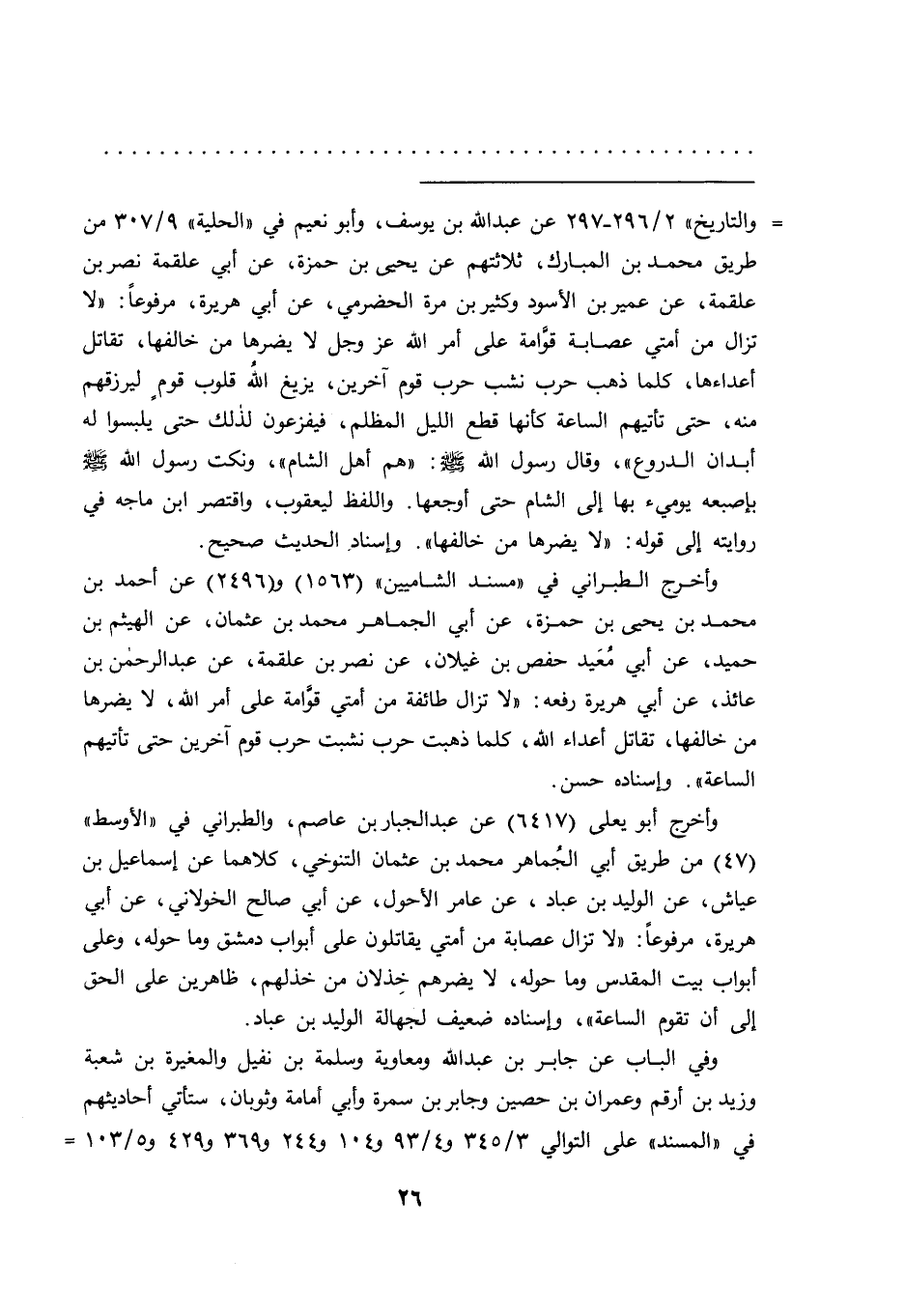 = والتاريخ" ٢/٢٩٦-٢٩٧ عن عبد الله بن يوسف، وأبو نعيم في "الحلية" ٩/٣٠٧ من طريق محمد بن المبارك، ثلاثتهم عن يحيى بن حمزة، عن أبي علقمة نصر بن علقمة، عن عمير بن الأسود وكثير بن مرة الحضرمي، عن أبي هريرة، مرفوعاً: "لا تزال من أمتي عصابة قوامة على أمر الله عز وجل لا يضرها من خالفها، تقاتل أعداءها، كلما ذهب حرب نشب حرب قوم آخرين، يزيغ الله قلوب قوم ليرزقهم منه، حتى تأتيهم الساعة كأنها قطع الليل المظلم، فيفزعون لذلك حتى يلبسوا له