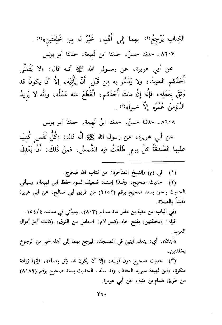 ٨٦٠٧ - حَدَّثَنَا حَسَنٌ، حَدَّثَنَا ابْنُ لَهِيعَةَ، حَدَّثَنَا أَبُو يُونُسَ، عَنْ أَبِي هُرَيْرَةَ عَنْ رَسُولِ اللهِ صَلَّى اللهُ عَلَيْهِ وَسَلَّمَ، أَنَّهُ قَالَ: " لَا يَتَمَنَّى أَحَدُكُمُ الْمَوْتَ، وَلَا يَدْعُو بِهِ مِنْ قَبْلِ أَنْ يَأْتِيَهُ، إِلَّا أَنْ يَكُونَ قَدْ وَثِقَ بِعَمَلِهِ، فَإِنَّهُ إِنْ مَاتَ أَحَدُكُمُ انْقَطَعَ عَنْهُ عَمَلُهُ، وَإِنَّهُ لَا يَزِيدُ الْمُؤْمِنَ عُمْرُهُ إِلَّا خَيْرًا " (٣)