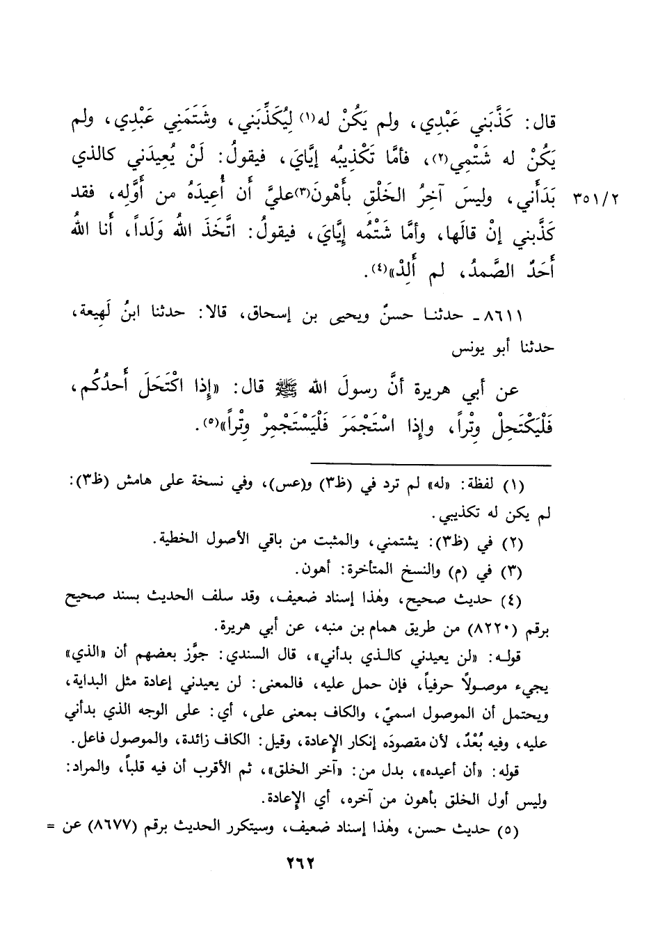 قَالَ: كَذَّبَنِي عَبْدِي، وَلَمْ يَكُنْ لَهُ (١) لِيُكَذِّبَنِي، وَشَتَمَنِي عَبْدِي، وَلَمْ يَكُنْ لَهُ (٢) شَتْمِي، فَأَمَّا تَكْذِيبُهُ إِيَّايَ، فَيَقُولُ: لَنْ يُعِيدَنِي كَالَّذِي بَدَأَنِي، وَلَيْسَ آخِرُ الْخَلْقِ بِأَهْوَنَ (٣) عَلَيَّ أَنْ أُعِيدَهُ مِنْ أَوَّلِهِ، فَقَدْ كَذَّبَنِي، إِنْ قَالَهَا، وَأَمَّا شَتْمُهُ إِيَّايَ، فَيَقُولُ: اتَّخَذَ اللهُ وَلَدًا، أَنَا اللهُ أَحَدٌ الصَّمَدُ لَمْ أَلِدْ " (٤)