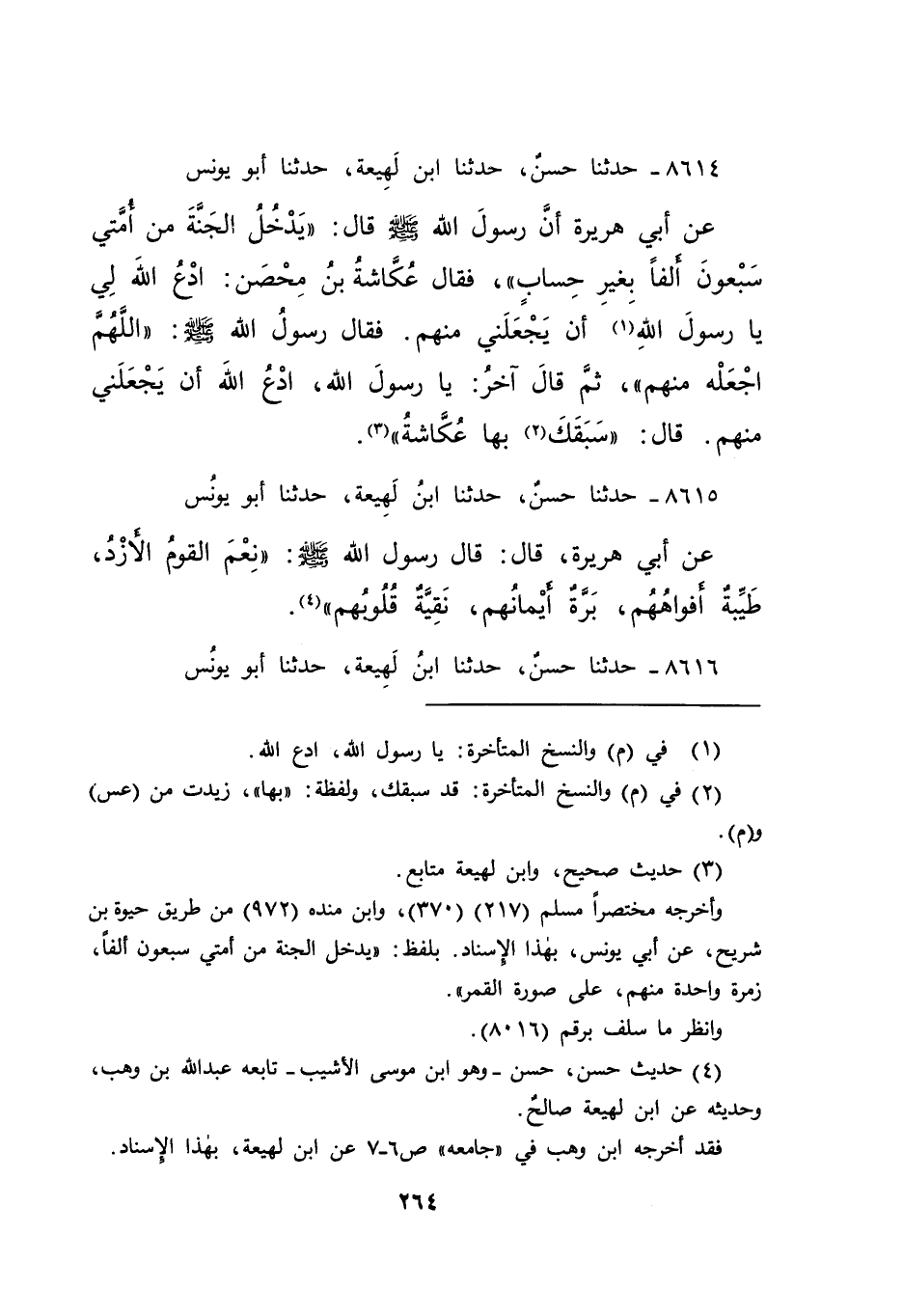 ٨٦١٤ - حَدَّثَنَا حَسَنٌ، حَدَّثَنَا ابْنُ لَهِيعَةَ، حَدَّثَنَا أَبُو يُونُسَ، عَنْ أَبِي هُرَيْرَةَ، أَنَّ رَسُولَ اللهِ صَلَّى اللهُ عَلَيْهِ وَسَلَّمَ، قَالَ: " يَدْخُلُ الْجَنَّةَ مِنْ أُمَّتِي سَبْعُونَ أَلْفًا بِغَيْرِ حِسَابٍ "، فَقَالَ عُكَّاشَةُ بْنُ مِحْصَنٍ: ادْعُ اللهَ لِي يَا رَسُولَ اللهِ (١) ، أَنْ يَجْعَلَنِي مِنْهُمْ، فَقَالَ رَسُولُ اللهِ صَلَّى اللهُ عَلَيْهِ وَسَلَّمَ: " اللهُمَّ اجْعَلْهُ مِنْهُمْ "، ثُمَّ قَالَ آخَرُ: يَا رَسُولَ اللهِ، ادْعُ اللهَ أَنْ يَجْعَلَنِي مِنْهُمْ، قَالَ: " سَبَقَكَ (٢) بِهَا عُكَّاشَةُ " (٣)