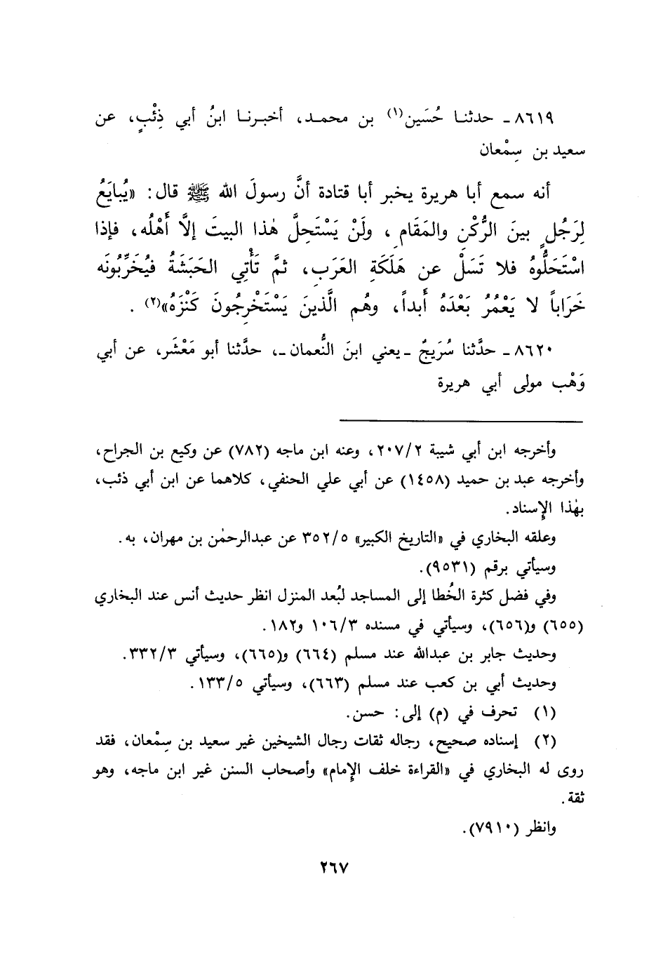 ٨٦١٩ - حَدَّثَنَا حُسَيْنُ (١) بْنُ مُحَمَّدٍ، أَخْبَرَنَا ابْنُ أَبِي ذِئْبٍ، عَنْ سَعِيدِ بْنِ سَمْعَانَ، أَنَّهُ سَمِعَ أَبَا هُرَيْرَةَ، يُخْبِرُ أَبَا قَتَادَةَ، أَنَّ رَسُولَ اللهِ صَلَّى اللهُ عَلَيْهِ وَسَلَّمَ، قَالَ: " يُبَايَعُ لِرَجُلٍ بَيْنَ الرُّكْنِ وَالْمَقَامِ، وَلَنْ يَسْتَحِلَّ هَذَا الْبَيْتَ إِلَّا أَهْلُهُ، فَإِذَا اسْتَحَلُّوهُ، فَلَا تَسَلْ عَنْ هَلَكَةِ الْعَرَبِ، ثُمَّ تَأْتِي الْحَبَشَةُ فَيُخَرِّبُونَهُ خَرَابًا لَا يَعْمُرُ بَعْدَهُ أَبَدًا، وَهُمُ الَّذِينَ يَسْتَخْرِجُونَ كَنْزَهُ " (٢)