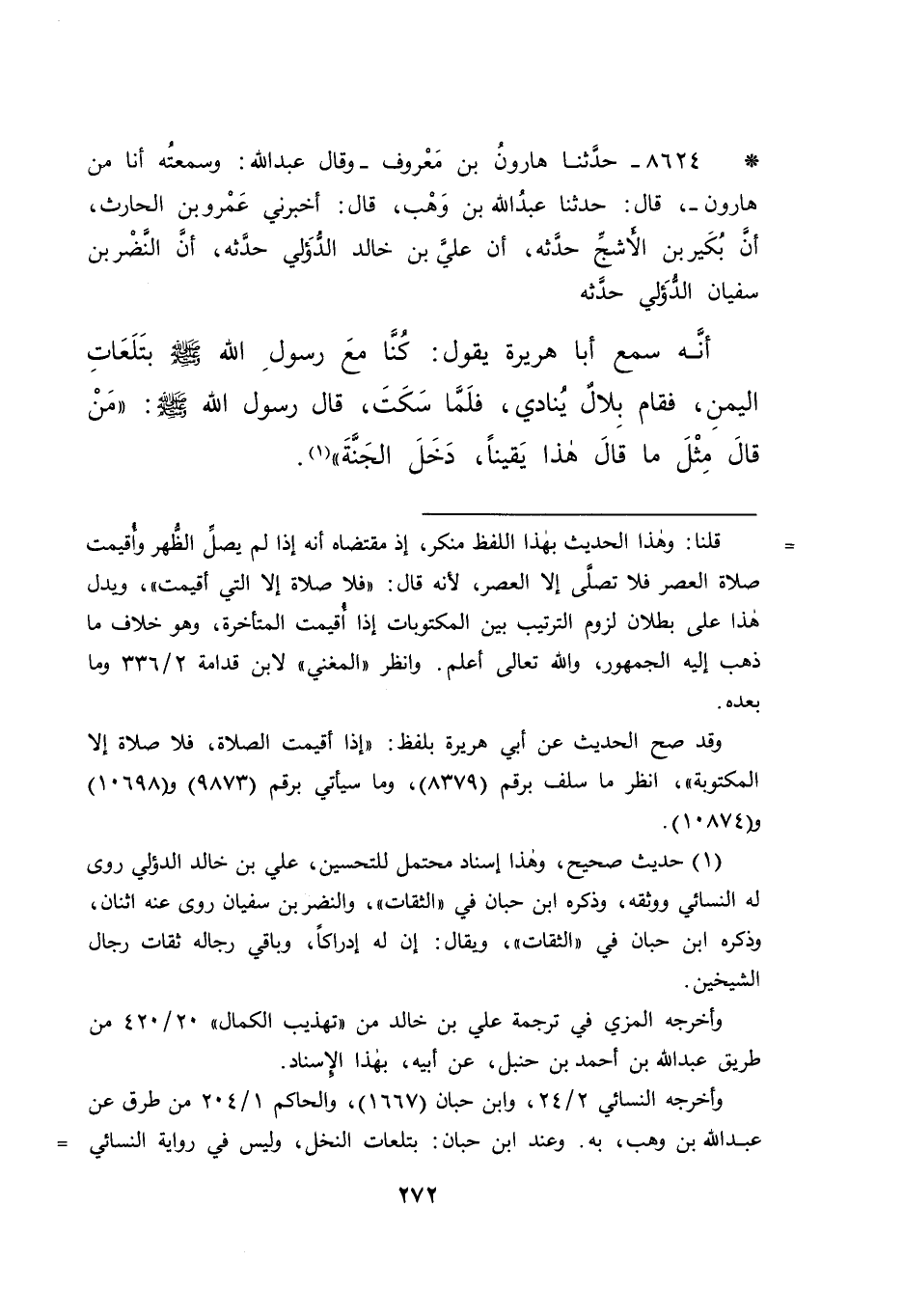• ٨٦٢٤ - حَدَّثَنَا هَارُونُ بْنُ مَعْرُوفٍ، وقَالَ عَبْدُ اللهِ: وَسَمِعْتُهُ أَنَا مِنْ هَارُونَ، قَالَ: حَدَّثَنَا عَبْدُ اللهِ بْنُ وَهْبٍ، قَالَ: أَخْبَرَنِي عَمْرُو بْنُ الْحَارِثِ، أَنَّ بُكَيْرَ بْنَ الْأَشَجِّ، حَدَّثَهُ أَنَّ عَلِيَّ بْنَ خَالِدٍ الدُّؤَلِيَّ، حَدَّثَهُ أَنَّ النَّضْرَ بْنَ سُفْيَانَ الدُّؤَلِيَّ، حَدَّثَهُ أَنَّهُ سَمِعَ أَبَا هُرَيْرَةَ، يَقُولُ: كُنَّا مَعَ رَسُولِ اللهِ صَلَّى اللهُ عَلَيْهِ وَسَلَّمَ بِتَلَعَاتِ الْيَمَنِ، فَقَامَ بِلَالٌ يُنَادِي، فَلَمَّا سَكَتَ، قَالَ رَسُولُ اللهِ صَلَّى اللهُ عَلَيْهِ وَسَلَّمَ: " مَنْ قَالَ مِثْلَ مَا قَالَ هَذَا يَقِينًا، دَخَلَ الْجَنَّةَ " (١)