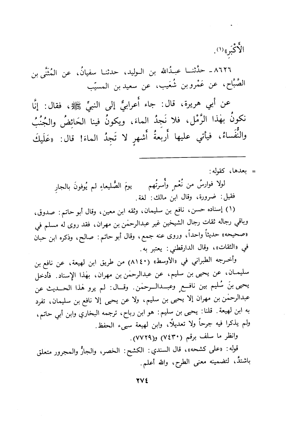 ٨٦٢٦ - حَدَّثَنَا عَبْدُ اللهِ بْنُ الْوَلِيدِ، حَدَّثَنَا سُفْيَانُ، عَنِ الْمُثَنَّى بْنِ الصَّبَّاحِ، عَنْ عَمْرِو بْنِ شُعَيْبٍ، عَنْ سَعِيدِ بْنِ الْمُسَيِّبِ، عَنْ أَبِي هُرَيْرَةَ، قَالَ: جَاءَ أَعْرَابِيٌّ إِلَى النَّبِيِّ صَلَّى اللهُ عَلَيْهِ وَسَلَّمَ فَقَالَ: إِنَّا نَكُونُ بِهَذَا الرَّمْلِ فَلَا نَجِدُ الْمَاءَ، وَيَكُونُ فِينَا الْحَائِضُ، وَالْجُنُبُ، وَالنُّفَسَاءُ، فَيَأْتِي عَلَيْهَا أَرْبَعَةُ أَشْهُرٍ لَا تَجِدُ الْمَاءَ، قَالَ: " عَلَيْكَ