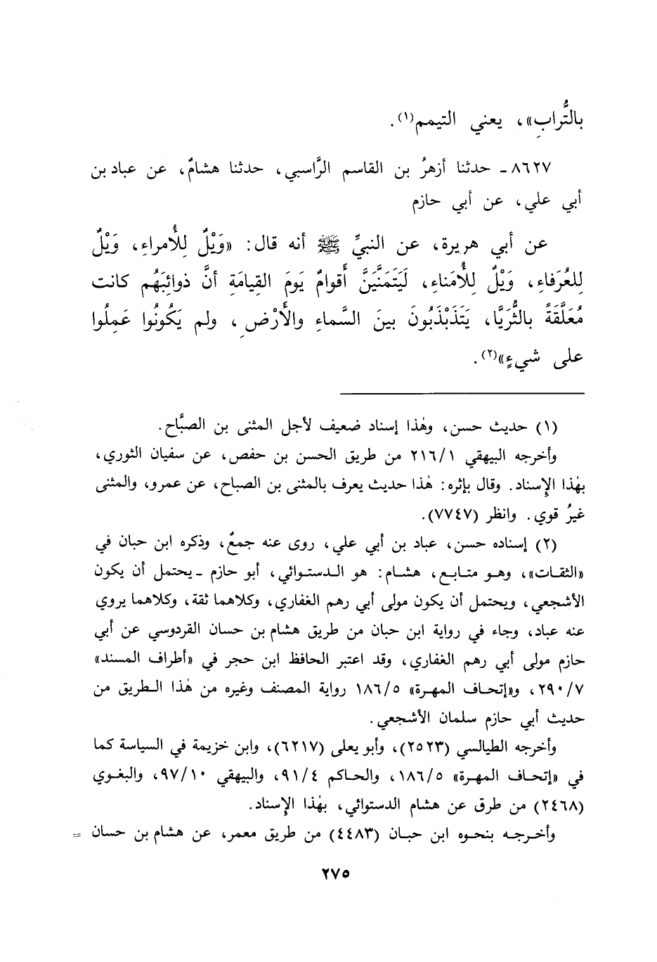 ٨٦٢٧ - حَدَّثَنَا أَزْهَرُ بْنُ الْقَاسِمِ الرَّاسِبِيُّ، حَدَّثَنَا هِشَامٌ، عَنْ عَبَّادِ بْنِ أَبِي عَلِيٍّ، عَنْ أَبِي حَازِمٍ، عَنْ أَبِي هُرَيْرَةَ، عَنِ النَّبِيِّ صَلَّى اللهُ عَلَيْهِ وَسَلَّمَ، أَنَّهُ قَالَ: " وَيْلٌ لِلْأُمَرَاءِ، وَيْلٌ لِلْعُرَفَاءِ، وَيْلٌ لِلْأُمَنَاءِ، لَيَتَمَنَّيَنَّ أَقْوَامٌ يَوْمَ الْقِيَامَةِ أَنَّ ذَوَائِبَهُمْ كَانَتْ مُعَلَّقَةً بِالثُّرَيَّا، يَتَذَبْذَبُونَ بَيْنَ السَّمَاءِ وَالْأَرْضِ، وَلَمْ يَكُونُوا عَمِلُوا عَلَى شَيْءٍ " (٢)