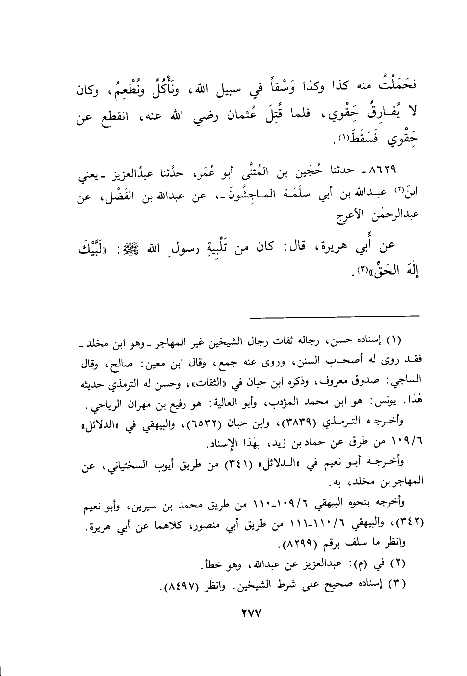 ٨٦٢٩ - حَدَّثَنَا حُجَيْنُ بْنُ الْمُثَنَّى أَبُو عُمَرَ، حَدَّثَنَا عَبْدُ الْعَزِيزِ يَعْنِي ابْنَ (٢) عَبْدِ اللهِ بْنِ أَبِي سَلَمَةَ الْمَاجِشُونِ، عَنْ عَبْدِ اللهِ بْنِ الْفَضْلِ، عَنْ عَبْدِ الرَّحْمَنِ الْأَعْرَجِ، عَنْ أَبِي هُرَيْرَةَ، قَالَ: كَانَ مِنْ تَلْبِيَةِ رَسُولِ اللهِ صَلَّى اللهُ عَلَيْهِ وَسَلَّمَ: " لَبَّيْكَ إِلَهَ الْحَقِّ " (٣)