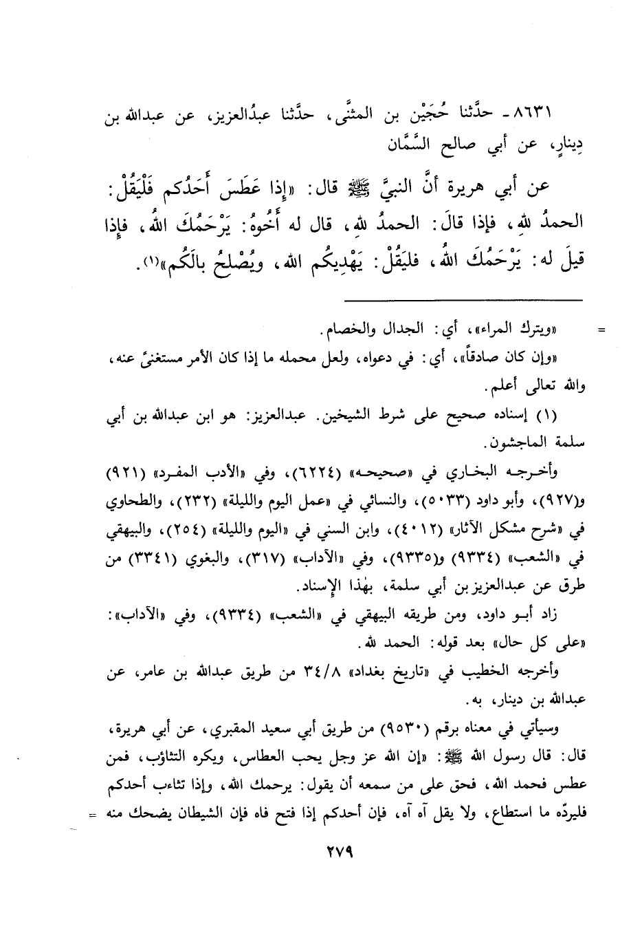 ٨٦٣١ - حَدَّثَنَا حُجَيْنُ بْنُ الْمُثَنَّى، حَدَّثَنَا عَبْدُ الْعَزِيزِ، عَنْ عَبْدِ اللهِ بْنِ دِينَارٍ، عَنْ أَبِي صَالِحٍ السَّمَّانِ، عَنْ أَبِي هُرَيْرَةَ، أَنَّ النَّبِيَّ صَلَّى اللهُ عَلَيْهِ وَسَلَّمَ، قَالَ: " إِذَا عَطَسَ أَحَدُكُمْ، فَلْيَقُلْ: الْحَمْدُ لِلَّهِ، فَإِذَا قَالَ: الْحَمْدُ لِلَّهِ، قَالَ لَهُ أَخُوهُ: يَرْحَمُكَ اللهُ، فَإِذَا قِيلَ لَهُ يَرْحَمُكَ اللهُ: فَلْيَقُلْ: يَهْدِيكُمُ اللهُ وَيُصْلِحُ بَالَكُمْ " (١)