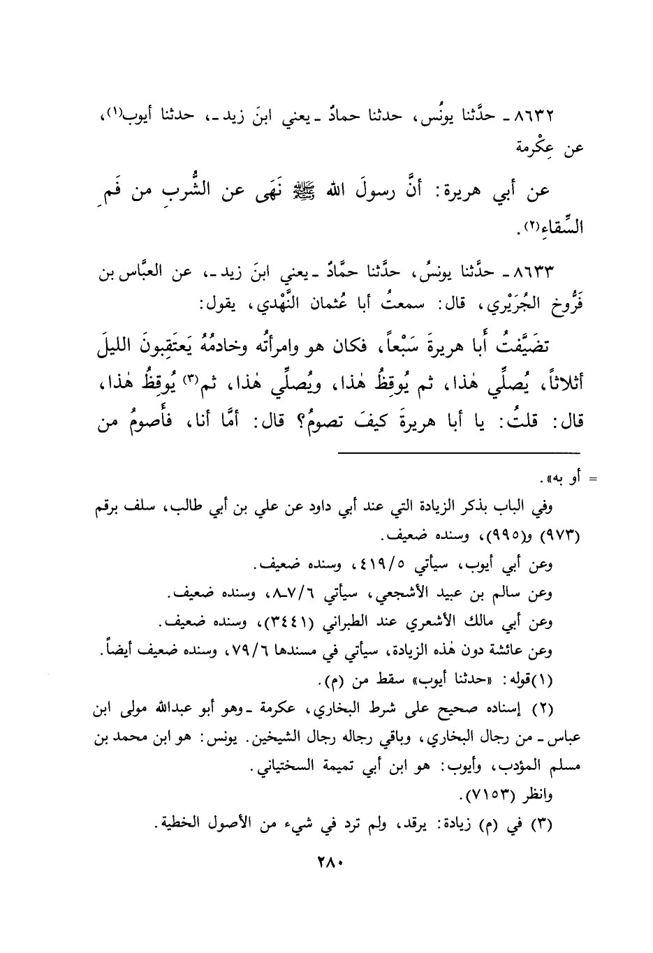 ٨٦٣٢ - حَدَّثَنَا يُونُسُ، حَدَّثَنَا حَمَّادٌ يَعْنِي ابْنَ زَيْدٍ، حَدَّثَنَا أَيُّوبُ (١) ، عَنْ عِكْرِمَةَ، عَنْ أَبِي هُرَيْرَةَ، " أَنَّ رَسُولَ اللهِ صَلَّى اللهُ عَلَيْهِ وَسَلَّمَ، نَهَى عَنِ الشُّرْبِ مِنْ فَمِ السِّقَاءِ " (٢)
