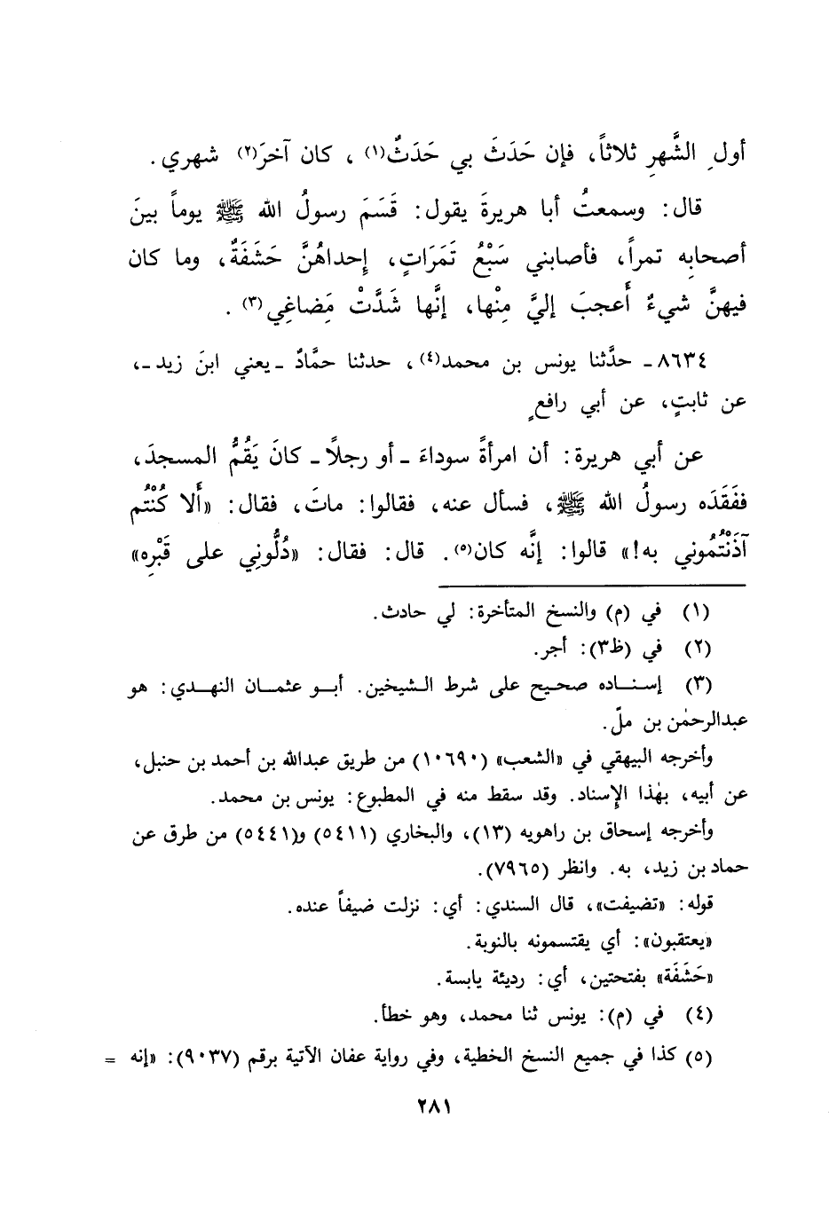 قَالَ: وَسَمِعْتُ أَبَا هُرَيْرَةَ، يَقُولُ: " قَسَمَ رَسُولُ اللهِ صَلَّى اللهُ عَلَيْهِ وَسَلَّمَ يَوْمًا بَيْنَ أَصْحَابِهِ تَمْرًا، فَأَصَابَنِي سَبْعُ تَمَرَاتٍ، إِحْدَاهُنَّ حَشَفَةٌ وَمَا كَانَ فِيهِنَّ شَيْءٌ أَعْجَبُ إِلَيَّ مِنْهَا، إِنَّهَا شَدَّتْ مَضَاغِي " (٣)