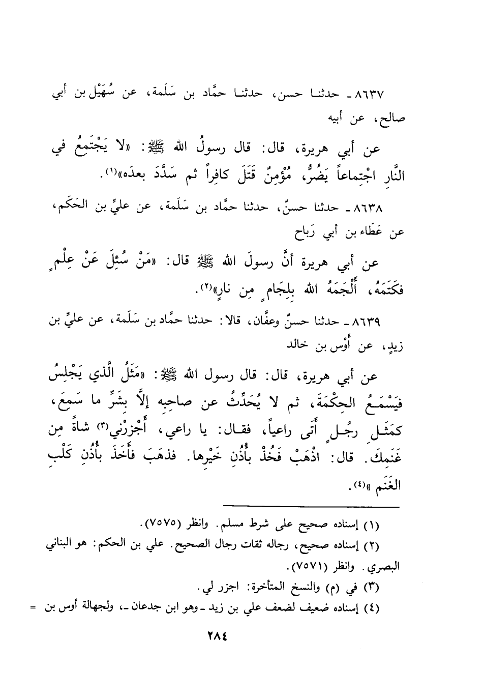 ٨٦٣٨ - حَدَّثَنَا حَسَنٌ، حَدَّثَنَا حَمَّادُ بْنُ سَلَمَةَ، عَنْ عَلِيِّ بْنِ الْحَكَمِ، عَنْ عَطَاءِ بْنِ أَبِي رَبَاحٍ، عَنْ أَبِي هُرَيْرَةَ، أَنَّ رَسُولَ اللهِ صَلَّى اللهُ عَلَيْهِ وَسَلَّمَ، قَالَ: " مَنْ سُئِلَ عَنْ عِلْمٍ فَكَتَمَهُ، أَلْجَمَهُ اللهُ بِلِجَامٍ مِنْ نَارٍ " (٢)
