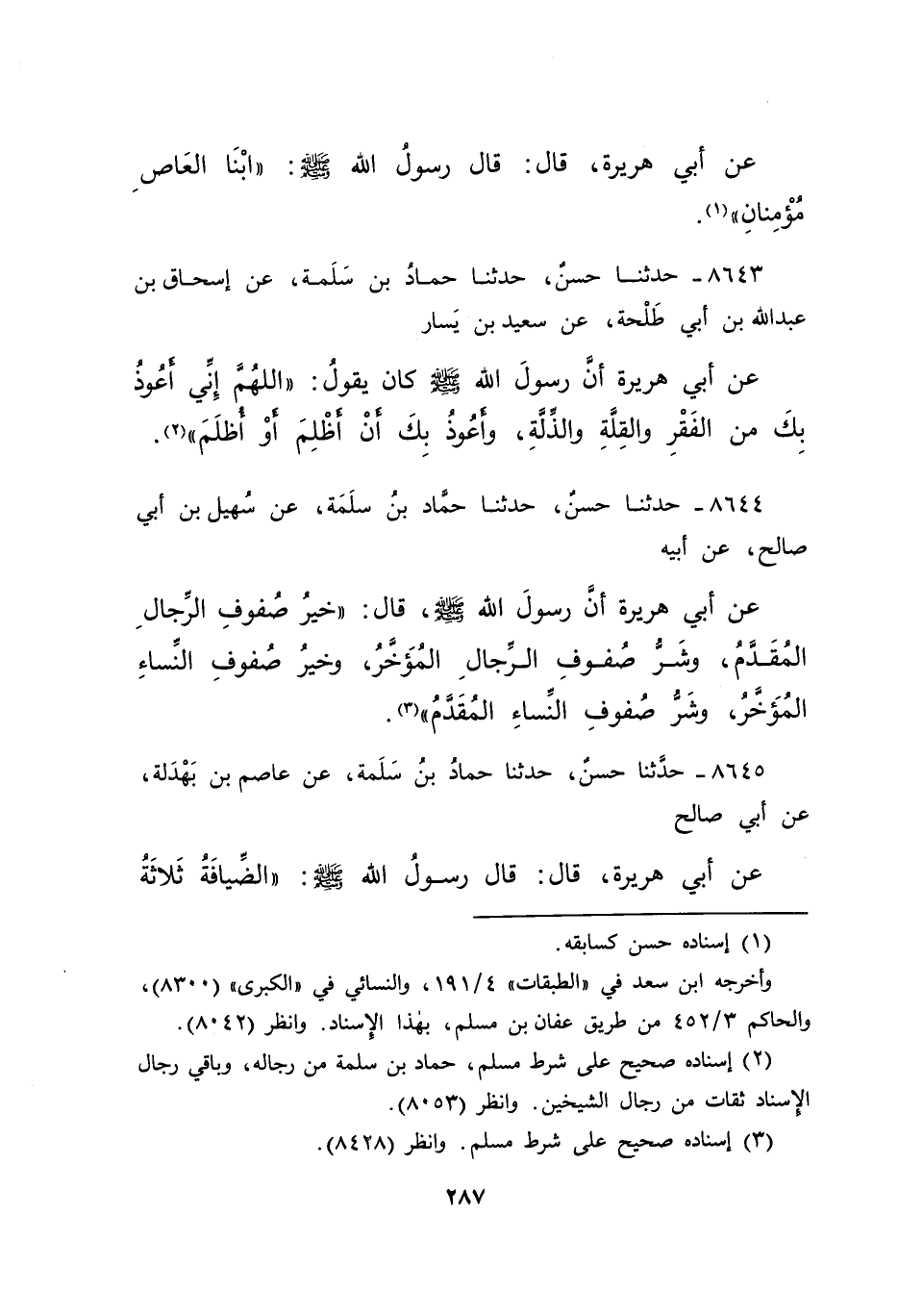 عَنْ أَبِي هُرَيْرَةَ، قَالَ: قَالَ رَسُولُ اللهِ صَلَّى اللهُ عَلَيْهِ وَسَلَّمَ: " ابْنَا الْعَاصِ مُؤْمِنَانِ " (١)