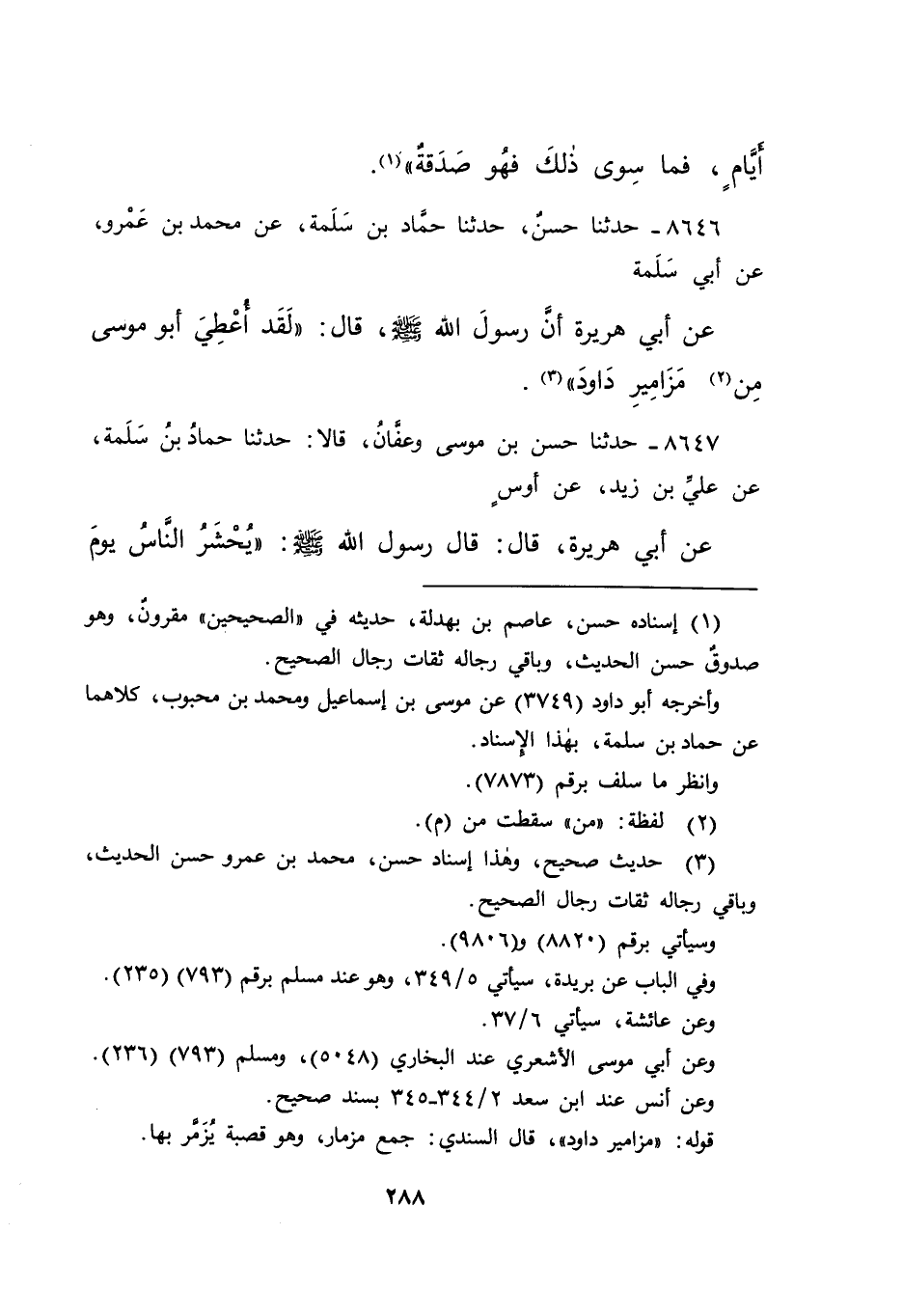 ٨٦٤٦ - حَدَّثَنَا حَسَنٌ، حَدَّثَنَا حَمَّادُ بْنُ سَلَمَةَ، عَنْ مُحَمَّدِ بْنِ عَمْرٍو، عَنْ أَبِي سَلَمَةَ، عَنْ أَبِي هُرَيْرَةَ، أَنَّ رَسُولَ اللهِ صَلَّى اللهُ عَلَيْهِ وَسَلَّمَ، قَالَ: " لَقَدْ أُعْطِيَ أَبُو مُوسَى مِنْ (٢) مَزَامِيرِ دَاوُدَ " (٣)