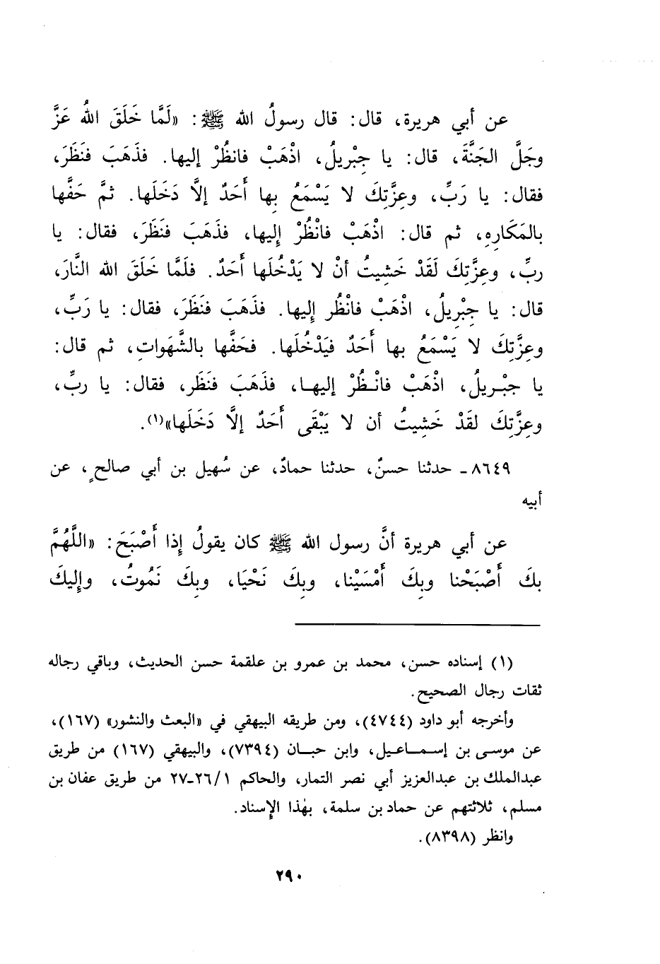 عَنْ أَبِي هُرَيْرَةَ، قَالَا: قَالَ رَسُولُ اللهِ صَلَّى اللهُ عَلَيْهِ وَسَلَّمَ: " لَمَّا خَلَقَ اللهُ عَزَّ وَجَلَّ الْجَنَّةَ، قَالَ: يَا جِبْرِيلُ، اذْهَبْ فَانْظُرْ إِلَيْهَا، فَذَهَبَ فَنَظَرَ، فَقَالَ: يَا رَبِّ، وَعِزَّتِكَ لَا يَسْمَعُ بِهَا أَحَدٌ إِلَّا دَخَلَهَا، ثُمَّ حَفَّهَا بِالْمَكَارِهِ،، ثُمَّ قَالَ: اذْهَبْ فَانْظُرْ إِلَيْهَا، فَذَهَبَ فَنَظَرَ، فَقَالَ: يَا رَبِّ، وَعِزَّتِكَ لَقَدْ خَشِيتُ أَنْ لَا يَدْخُلَهَا أَحَدٌ، فَلَمَّا خَلَقَ اللهُ النَّارَ، قَالَ: يَا جِبْرِيلُ، اذْهَبْ فَانْظُرْ إِلَيْهَا، فَذَهَبَ فَنَظَرَ، فَقَالَ: يَا رَبِّ، وَعِزَّتِكَ لَا يَسْمَعُ بِهَا أَحَدٌ فَيَدْخُلُهَا، فَحَفَّهَا بِالشَّهَوَاتِ، ثُمَّ قَالَ: يَا جِبْرِيلُ، اذْهَبْ فَانْظُرْ إِلَيْهَا، فَذَهَبَ فَنَظَرَ، فَقَالَ: يَا رَبِّ، وَعِزَّتِكَ لَقَدْ خَشِيتُ أَنْ لَا يَبْقَى أَحَدٌ إِلَّا دَخَلَهَا " (١)