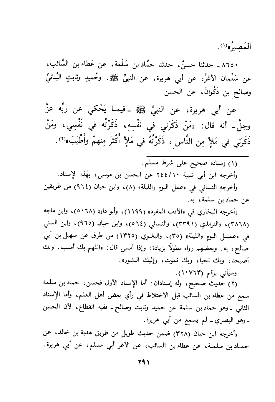 ٨٦٥٠ - حَدَّثَنَا حَسَنٌ، حَدَّثَنَا حَمَّادُ بْنُ سَلَمَةَ، عَنْ عَطَاءِ بْنِ السَّائِبِ، عَنْ سَلْمَانَ الْأَغَرِّ، عَنْ أَبِي هُرَيْرَةَ، عَنِ النَّبِيِّ صَلَّى اللهُ عَلَيْهِ وَسَلَّمَ، وَحُمَيْدٍ، وَثَابِتٍ الْبُنَانِيِّ، وَصَالِحِ بْنِ ذَكْوَانَ، عَنِ الْحَسَنِ، عَنْ أَبِي هُرَيْرَةَ، عَنِ النَّبِيِّ صَلَّى اللهُ عَلَيْهِ وَسَلَّمَ فِيمَا يَحْكِي عَنْ رَبِّهِ عَزَّ وَجَلَّ، أَنَّهُ قَالَ: " مَنْ ذَكَرَنِي فِي نَفْسِهِ، ذَكَرْتُهُ فِي نَفْسِي، وَمَنْ ذَكَرَنِي فِي مَلَأٍ مِنَ النَّاسِ، ذَكَرْتُهُ فِي مَلَأٍ أَكْثَرَ مِنْهُمْ وَأَطْيَبَ " (٢)
