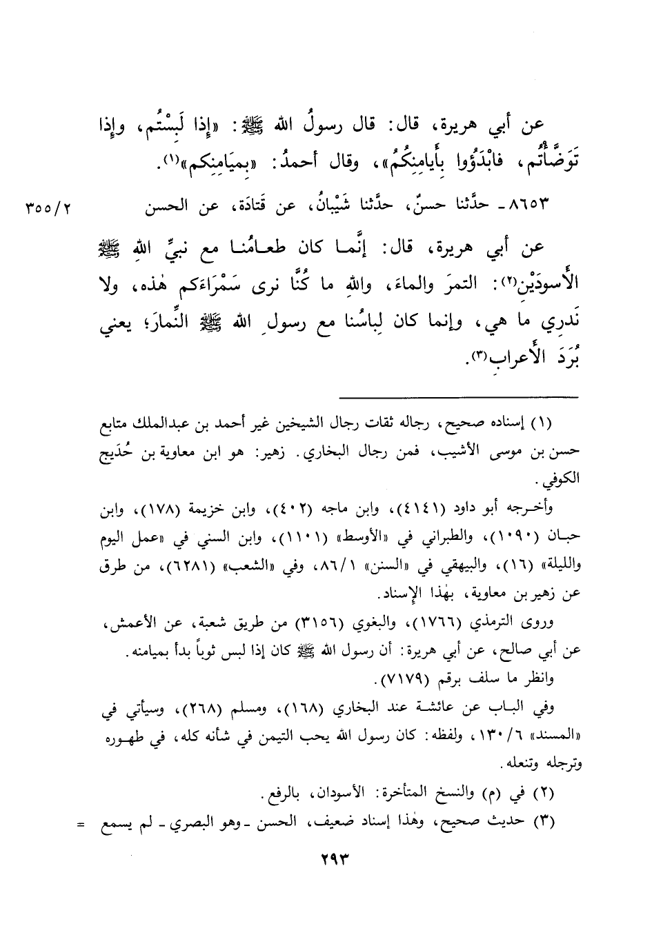 عَنْ أَبِي هُرَيْرَةَ، قَالَ: قَالَ رَسُولُ اللهِ صَلَّى اللهُ عَلَيْهِ وَسَلَّمَ: " إِذَا لَبِسْتُمْ، وَإِذَا تَوَضَّأْتُمْ، فَابْدَءُوا بِأَيَامِنِكُمْ "، وَقَالَ أَحْمَدُ: " بِمَيَامِنِكُمْ " (١)