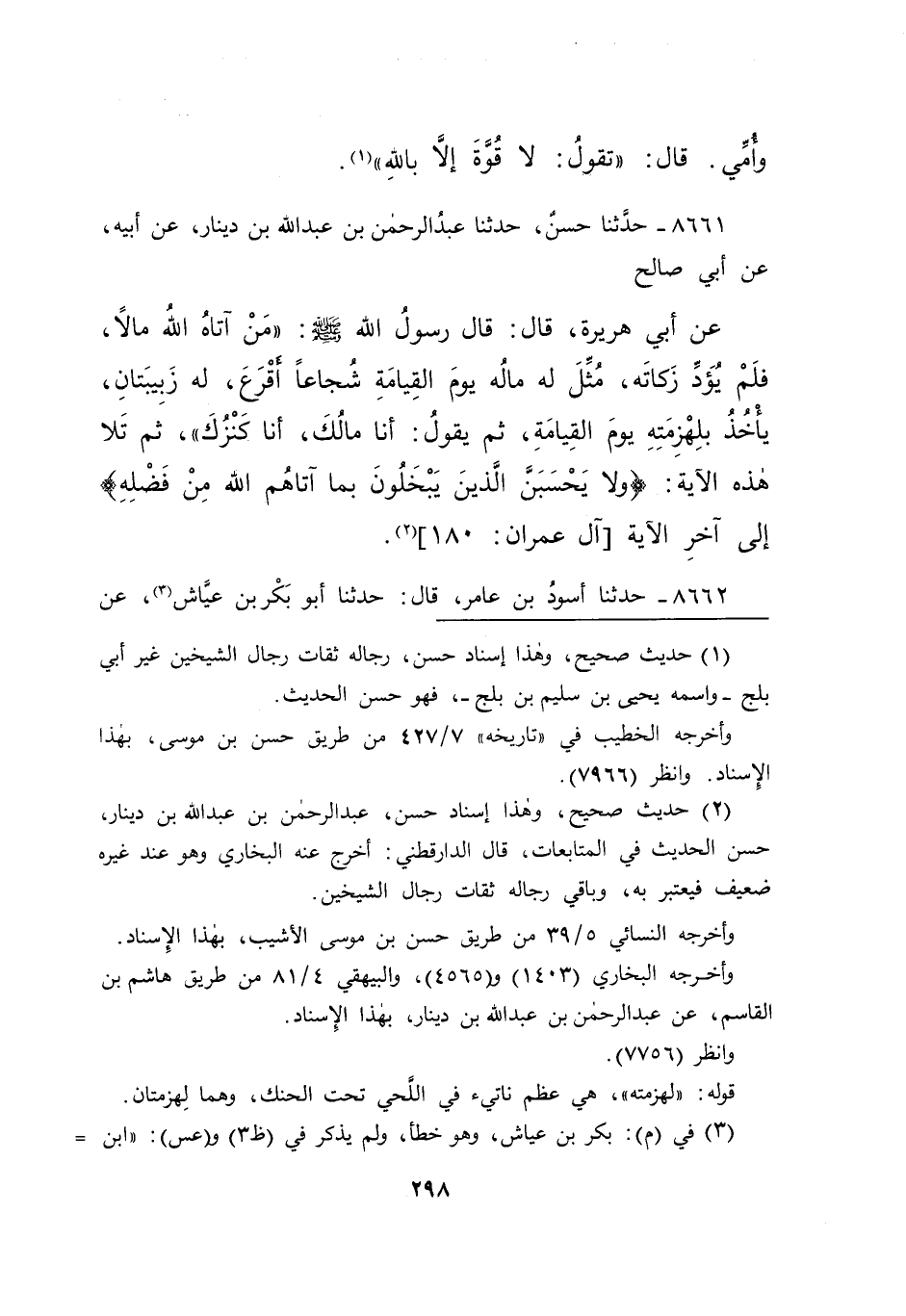 ٨٦٦١ - حَدَّثَنَا حَسَنٌ، حَدَّثَنَا عَبْدُ الرَّحْمَنِ بْنُ عَبْدِ اللهِ بْنِ دِينَارٍ، عَنْ أَبِيهِ، عَنْ أَبِي صَالِحٍ، عَنْ أَبِي هُرَيْرَةَ، قَالَ: قَالَ رَسُولُ اللهِ صَلَّى اللهُ عَلَيْهِ وَسَلَّمَ: " مَنْ آتَاهُ اللهُ مَالًا، فَلَمْ يُؤَدِّ زَكَاتَهُ، مُثِّلَ لَهُ مَالُهُ يَوْمَ الْقِيَامَةِ شُجَاعًا أَقْرَعَ، لَهُ زَبِيبَتَانِ، يَأْخُذُ بِلِهْزِمَتِهِ يَوْمَ الْقِيَامَةِ، ثُمَّ يَقُولُ: " أَنَا مَالُكَ، أَنَا كَنْزُكَ "، ثُمَّ تَلَا هَذِهِ الْآيَةَ {ولَا يَحْسَبَنَّ الَّذِينَ يَبْخَلُونَ بِمَا آتَاهُمُ اللهُ مِنْ فَضْلِهِ} [آل عمران: ١٨٠] إِلَى آخِرِ الْآيَةَ