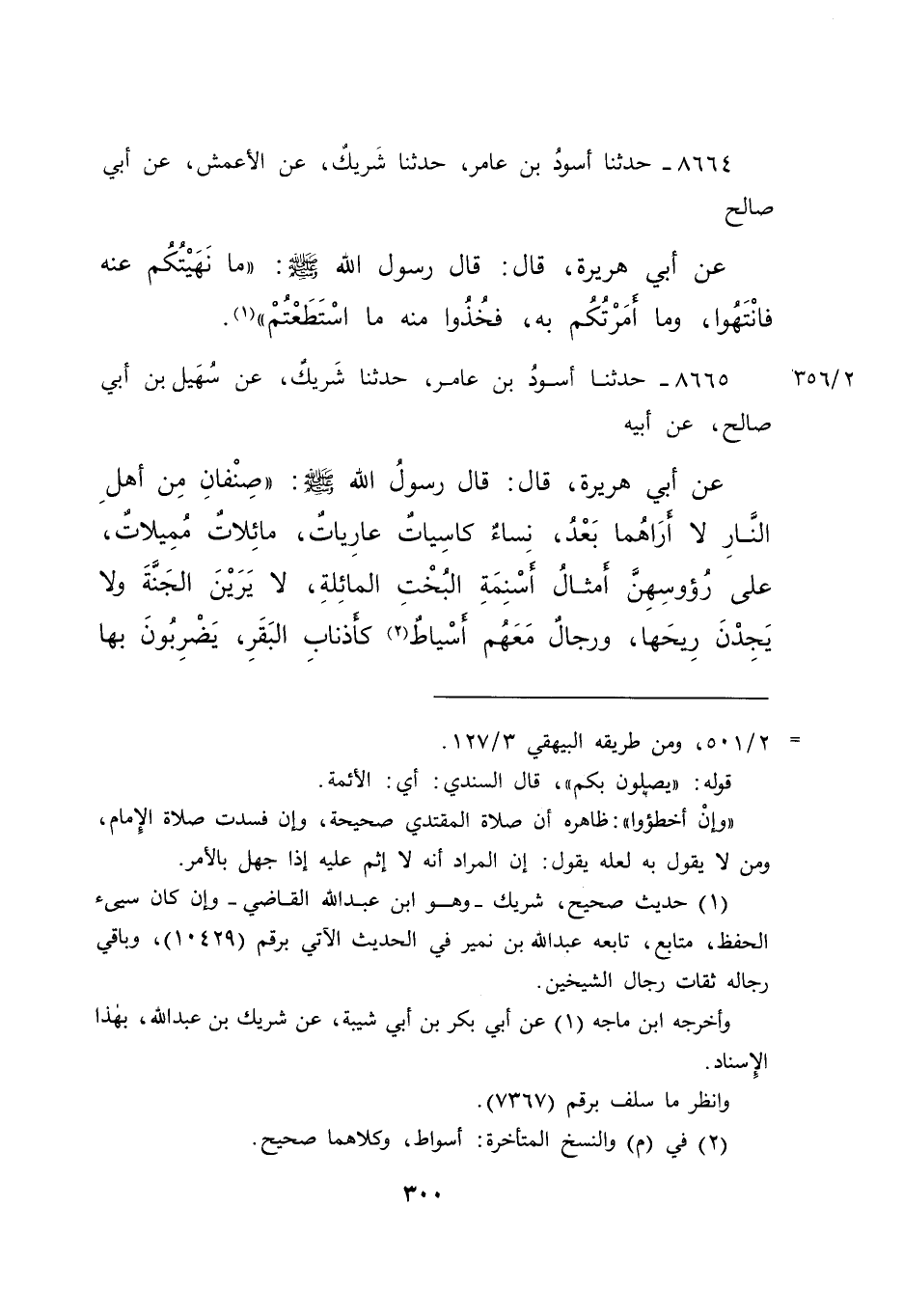 ٨٦٦٥ - حَدَّثَنَا أَسْوَدُ بْنُ عَامِرٍ، حَدَّثَنَا شَرِيكٌ، عَنْ سُهَيْلِ بْنِ أَبِي صَالِحٍ، عَنْ أَبِيهِ، عَنْ أَبِي هُرَيْرَةَ، قَالَ: قَالَ رَسُولُ اللهِ صَلَّى اللهُ عَلَيْهِ وَسَلَّمَ: " صِنْفَانِ مِنْ أَهْلِ النَّارِ لَا أَرَاهُمَا بَعْدُ، نِسَاءٌ كَاسِيَاتٌ عَارِيَاتٌ، مَائِلَاتٌ، مُمِيلَاتٌ، عَلَى رُءُوسِهِنَّ أَمْثَالُ أَسْنِمَةِ الْبُخْتِ الْمَائِلَةِ، لَا يَرَيْنَ الْجَنَّةَ، وَلَا يَجِدْنَ رِيحَهَا، وَرِجَالٌ مَعَهُمْ أَسْيَاطٌ (٢) كَأَذْنَابِ الْبَقَرِ، يَضْرِبُونَ بِهَا