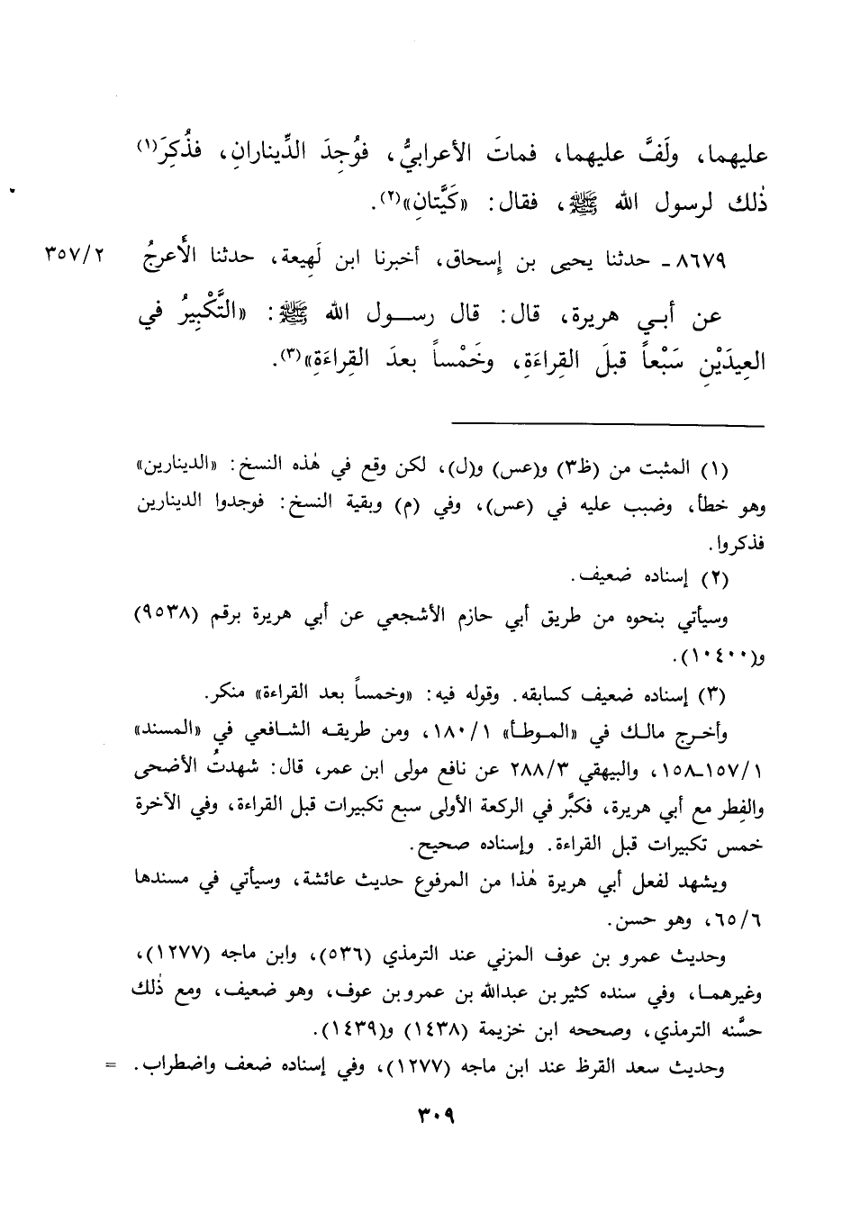 وأخرج مالك في "الموطأ" ١/١٨٠، ومن طريقه الشافعي في "المسند" ١/١٥٧-١٥٨، والبيهقي ٣/٢٨٨ عن نافع مولى ابن عمر، قال: شهدتُ الأضحى والفِطر مع أبي هريرة، فكبر في الركعة الأولى سبع تكبيرات قبل القراءة، وفي الآخرة خمس تكبيرات قبل القراءة. وإسناده صحيح.