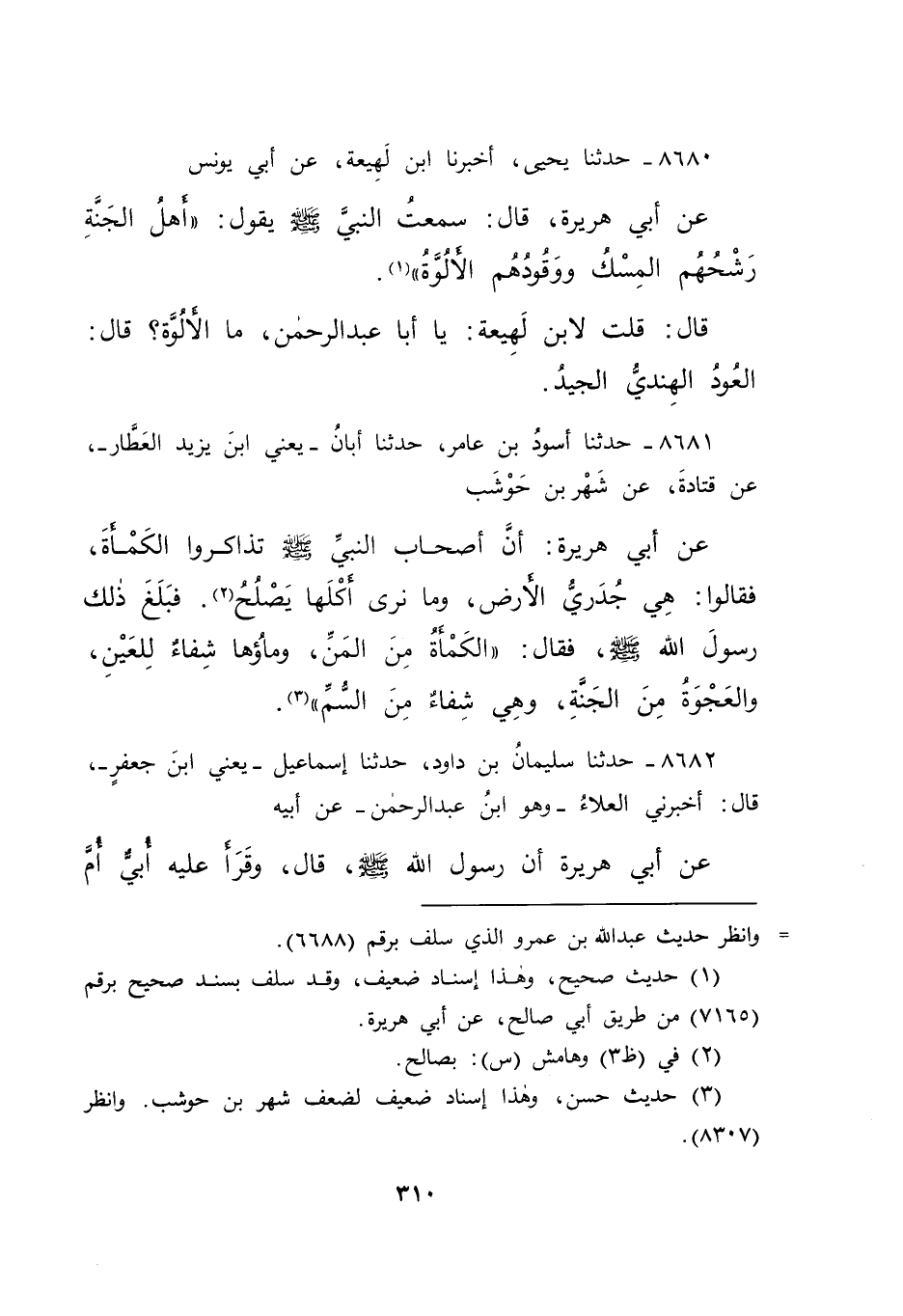 ٨٦٨١ - حَدَّثَنَا أَسْوَدُ بْنُ عَامِرٍ، حَدَّثَنَا أَبَانُ يَعْنِي ابْنَ يَزِيدَ الْعَطَّارَ، عَنْ قَتَادَةَ، عَنْ شَهْرِ بْنِ حَوْشَبٍ، عَنْ أَبِي هُرَيْرَةَ، أَنَّ أَصْحَابَ النَّبِيِّ صَلَّى اللهُ عَلَيْهِ وَسَلَّمَ، تَذَاكَرُوا الْكَمَأَةَ، فَقَالُوا: هِيَ جُدَرِيُّ الْأَرْضِ، وَمَا نَرَى أَكْلَهَا يَصْلُحُ (٢) ، فَبَلَغَ ذَلِكَ رَسُولَ اللهِ صَلَّى اللهُ عَلَيْهِ وَسَلَّمَ، فَقَالَ: " الْكَمَأَةُ مِنَ الْمَنِّ، وَمَاؤُهَا شِفَاءٌ لِلْعَيْنِ، وَالْعَجْوَةُ مِنَ الْجَنَّةِ، وَهِيَ شِفَاءٌ مِنَ السُّمِّ " (٣)