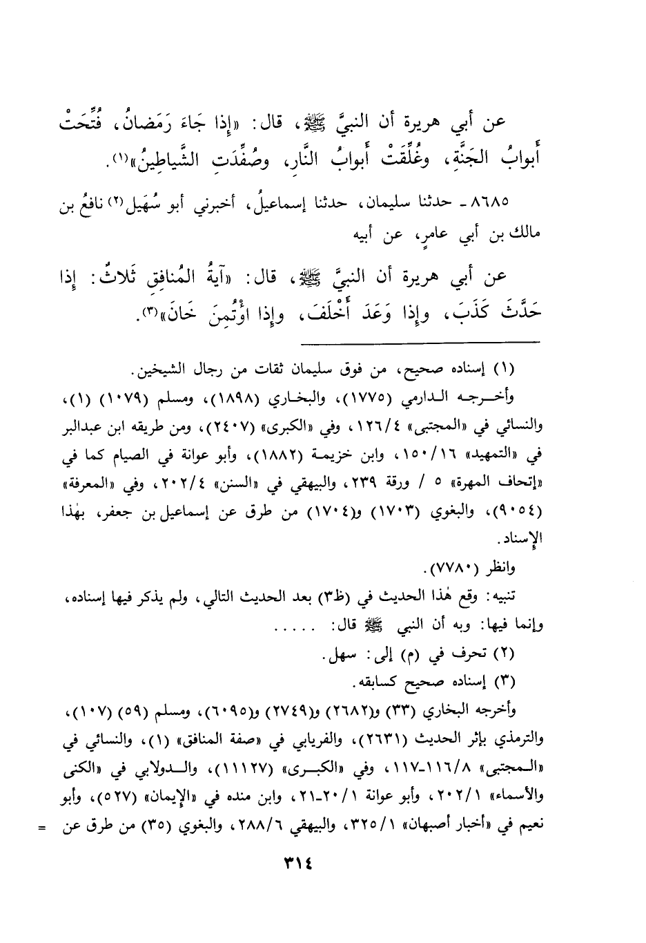 ٨٦٨٥ - حَدَّثَنَا سُلَيْمَانُ، حَدَّثَنَا إِسْمَاعِيلُ، أَخْبَرَنِي أَبُو سُهَيْلٍ (٢) نَافِعُ بْنُ مَالِكِ بْنِ أَبِي عَامِرٍ، عَنْ أَبِيهِ، عَنْ أَبِي هُرَيْرَةَ، أَنَّ النَّبِيَّ صَلَّى اللهُ عَلَيْهِ وَسَلَّمَ، قَالَ: " آيَةُ الْمُنَافِقِ ثَلَاثٌ: إِذَا حَدَّثَ كَذَبَ، وَإِذَا وَعَدَ أَخْلَفَ، وَإِذَا اؤْتُمِنَ خَانَ " (٣)