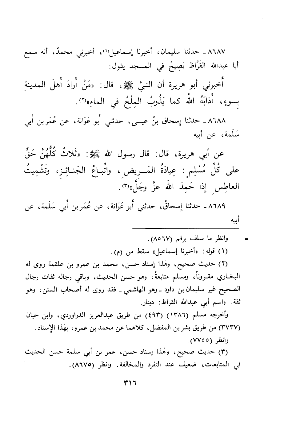 ٨٦٨٨ - حَدَّثَنَا إِسْحَاقُ بْنُ عِيسَى، حَدَّثَنِي أَبُو عَوَانَةَ، عَنْ عُمَرَ بْنِ أَبِي سَلَمَةَ، عَنْ أَبِيهِ، عَنْ أَبِي هُرَيْرَةَ، قَالَ: قَالَ رَسُولُ اللهِ صَلَّى اللهُ عَلَيْهِ وَسَلَّمَ: " ثَلَاثٌ كُلُّهُنَّ حَقٌّ عَلَى كُلِّ مُسْلِمٍ: عِيَادَةُ الْمَرِيضِ، وَاتِّبَاعُ الْجَنَائِزِ، وَتَشْمِيتُ الْعَاطِسِ، إِذَا حَمِدَ اللهَ عَزَّ وَجَلَّ " (٣)