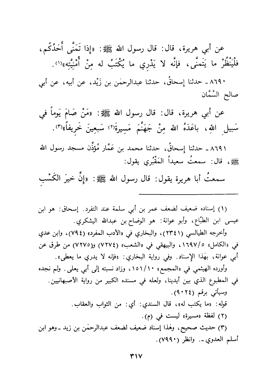 ٨٦٩٠ - حَدَّثَنَا إِسْحَاقُ، حَدَّثَنَا عَبْدُ الرَّحْمَنِ بْنُ زَيْدٍ، عَنْ أَبِيهِ، عَنْ أَبِي صَالِحٍ السَّمَّانِ، عَنْ أَبِي هُرَيْرَةَ، قَالَ: قَالَ رَسُولُ اللهِ صَلَّى اللهُ عَلَيْهِ وَسَلَّمَ: " مَنْ صَامَ يَوْمًا فِي سَبِيلِ اللهِ، بَاعَدَهُ اللهُ مِنْ جَهَنَّمَ مَسِيرَةَ (٢) سَبْعِينَ خَرِيفًا " (٣)