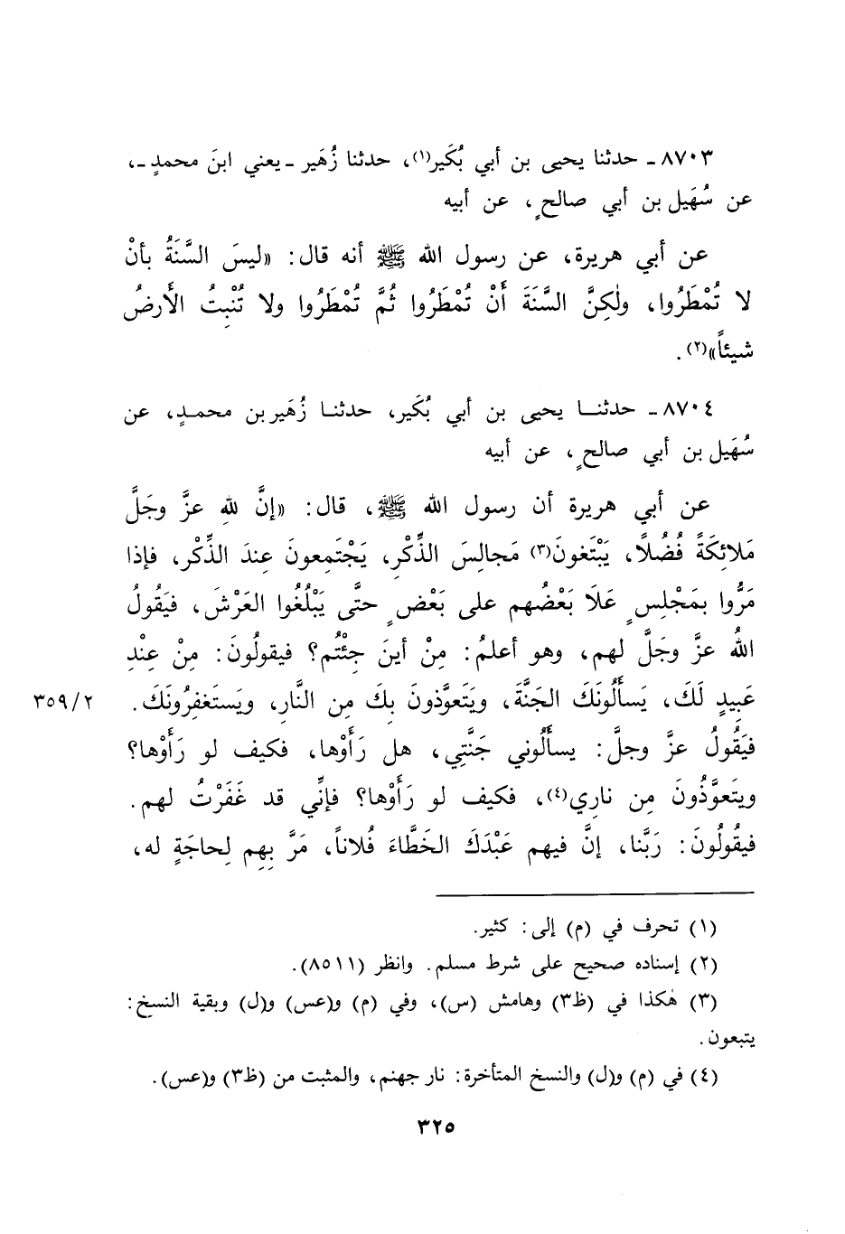٨٧٠٣ - حَدَّثَنَا يَحْيَى بْنُ أَبِي بُكَيْرٍ (١) ، حَدَّثَنَا زُهَيْرٌ يَعْنِي ابْنَ مُحَمَّدٍ، عَنْ سُهَيْلِ بْنِ أَبِي صَالِحٍ، عَنْ أَبِيهِ، عَنْ أَبِي هُرَيْرَةَ، عَنْ رَسُولِ اللهِ صَلَّى اللهُ عَلَيْهِ وَسَلَّمَ، أَنَّهُ قَالَ: " لَيْسَ السَّنَةُ بِأَنْ لَا تُمْطَرُوا، وَلَكِنَّ السَّنَةَ أَنْ تُمْطَرُوا، ثُمَّ تُمْطَرُوا، وَلَا تُنْبِتُ الْأَرْضُ شَيْئًا " (٢)