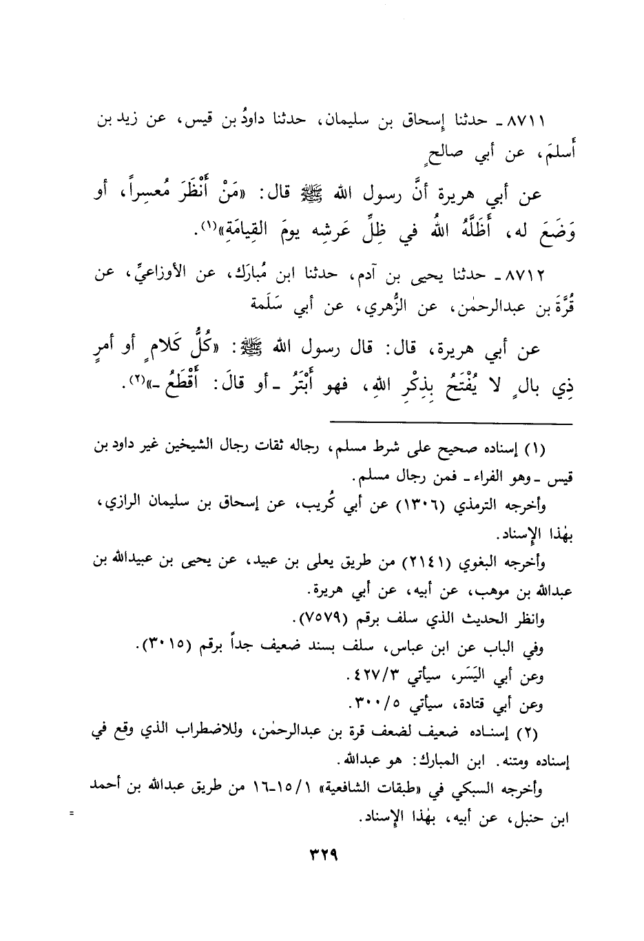 ٨٧١٢ - حَدَّثَنَا يَحْيَى بْنُ آدَمَ، حَدَّثَنَا ابْنُ مُبَارَكٍ، عَنِ الْأَوْزَاعِيِّ، عَنْ قُرَّةَ بْنِ عَبْدِ الرَّحْمَنِ، عَنِ الزُّهْرِيِّ، عَنْ أَبِي سَلَمَةَ، عَنْ أَبِي هُرَيْرَةَ، قَالَ: قَالَ رَسُولُ اللهِ صَلَّى اللهُ عَلَيْهِ وَسَلَّمَ: " كُلُّ كَلَامٍ، أَوْ أَمْرٍ ذِي بَالٍ لَا يُفْتَحُ بِذِكْرِ اللهِ، فَهُوَ أَبْتَرُ - أَوْ قَالَ: أَقْطَعُ - " (٢)