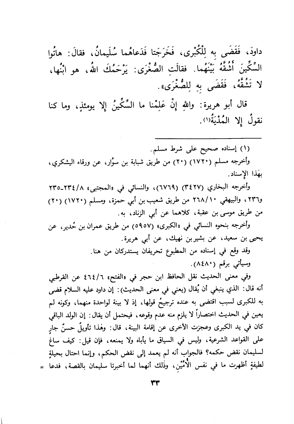 وفي معنى الحديث نقل الحافظ ابن حجر في "الفتح" ٦/٤٦٤ عن القرطبي أنه قال: الذي ينبغي أن يُقال (يعني في معنى الحديث) : إن داود عليه السلام قضى به للكبرى لسبب اقتضى به عنده ترجيح قولها، إذ لا بينة لواحدة منهما، وكونه لم يعين في الحديث اختصاراً لا يلزم منه عدم وقوعه، فيحتمل أن يقال: إن الولد الباقي كان في يد الكبرى وعجزت الأخرى عن إقامة البينة، قال: وهذا تأويل حسن جارٍ على القواعد الشرعية، وليس في السياق ما يأباه ولا يمنعه، فإن قيل: كيف ساغ