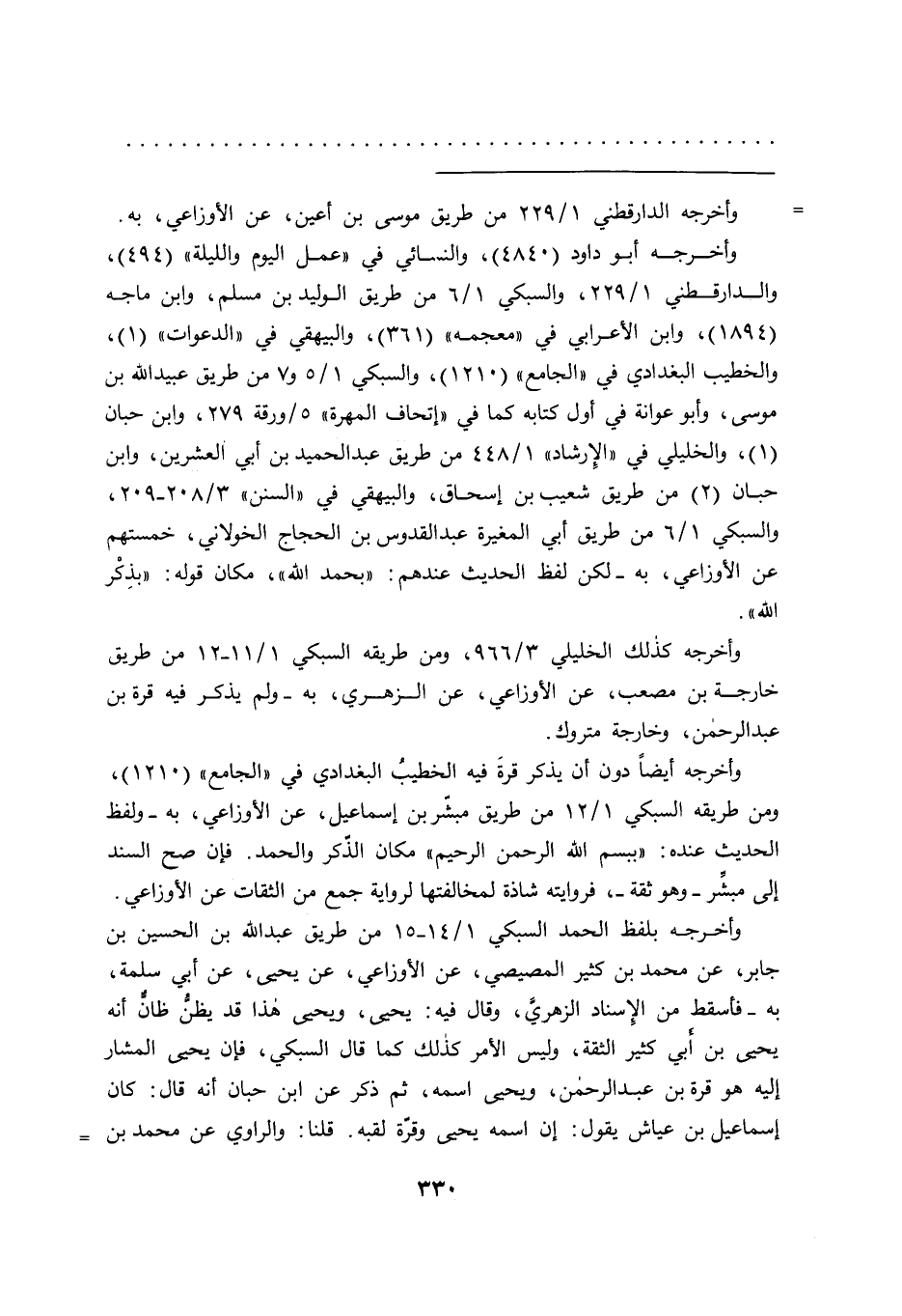 وأخرجه أيضاً دون أن يذكر قرةَ فيه الخطيب البغدادي في "الجامع" (١٢١٠) ، ومن طريقه السبكي ١/١٢ من طريق مبشر بن إسماعيل، عن الأوزاعي، به -ولفظ الحديث عنده: "ببسم الله الرحمن الرحيم" مكان الذكر والحمد. فإن صح السند إلى مبشَر -وهو ثقة-، فروايته شاذة لمخالفتها لرواية جمع من الثقات عن الأوزاعي.