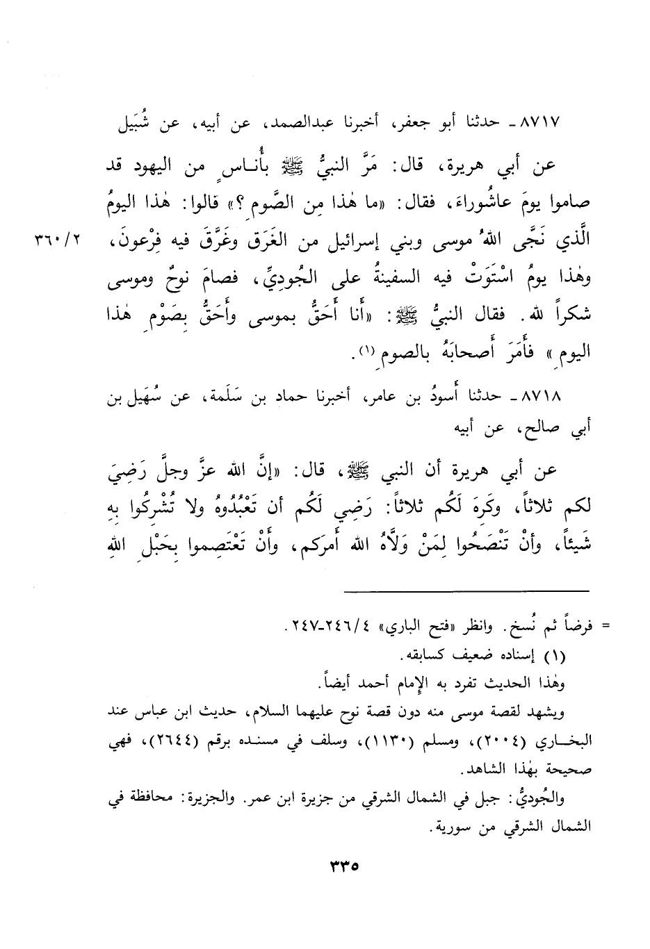 ٨٧١٨ - حَدَّثَنَا أَسْوَدُ بْنُ عَامِرٍ، أَخْبَرَنَا حَمَّادُ بْنُ سَلَمَةَ، عَنْ سُهَيْلِ بْنِ أَبِي صَالِحٍ، عَنْ أَبِيهِ، عَنْ أَبِي هُرَيْرَةَ، أَنَّ النَّبِيَّ صَلَّى اللهُ عَلَيْهِ وَسَلَّمَ قَالَ: " إِنَّ اللهَ عَزَّ وَجَلَّ رَضِيَ لَكُمْ ثَلَاثًا، وَكَرِهَ لَكُمْ ثَلَاثًا: رَضِيَ لَكُمْ أَنْ تَعْبُدُوهُ وَلَا تُشْرِكُوا بِهِ شَيْئًا، وَأَنْ تَنْصَحُوا لِمَنْ وَلَّاهُ اللهُ أَمْرَكُمْ، وَأَنْ تَعْتَصِمُوا بِحَبْلِ اللهِ