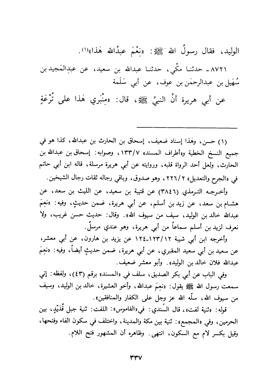 وأخرجه الترمذي (٣٨٤٦) عن قتيبة بن سعيد، عن الليث بن سعد، عن هشام بن سعد، عن زيد بن أسلم، عن أبي هريرة، ضمن حديثٍ، وفيه: "نعِمَ عبد الله خالد بن الوليد، سيف من سيوف الله". وقال: حديث حسن غريب، ولا نعرف لزيد بن أسلم سماعاً من أبي هريرة، وهو عندي مرسل.