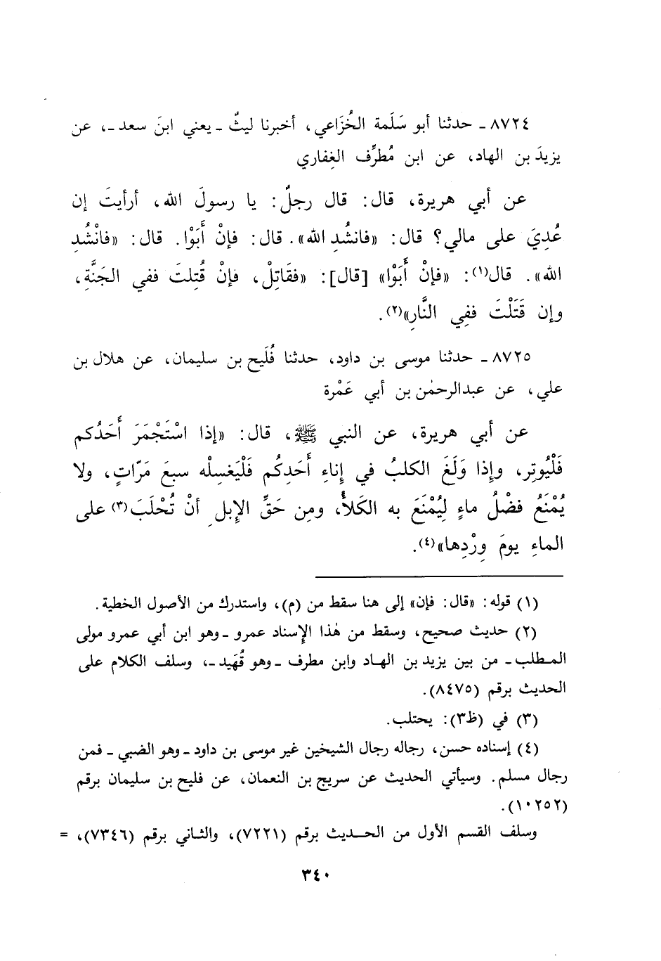 ٨٧٢٤ - حَدَّثَنَا أَبُو سَلَمَةَ الْخُزَاعِيُّ، أَخْبَرَنَا لَيْثٌ يَعْنِي ابْنَ سَعْدٍ، عَنْ يَزِيدَ بْنِ الْهَادِ، عَنِ ابْنِ مُطَرِّفٍ الْغِفَارِيِّ، عَنْ أَبِي هُرَيْرَةَ، قَالَ: قَالَ رَجُلٌ: يَا رَسُولَ اللهِ، أَرَأَيْتَ إِنْ عُدِيَ عَلَى مَالِي؟ قَالَ: " فَانْشُدِ اللهَ "، قَالَ: فَإِنْ أَبَوْا؟ قَالَ: فَانْشُدِ اللهَ، قَالَ (١) : فَإِنْ أَبَوْا [قَالَ] : " فَقَاتِلْ، فَإِنْ قُتِلْتَ فَفِي الْجَنَّةِ، وَإِنْ قَتَلْتَ فَفِي النَّارِ " (٢)