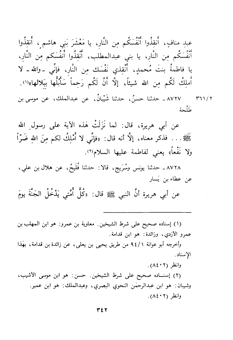 ٨٧٢٧ - حَدَّثَنَا حُسَيْنٌ، حَدَّثَنَا شَيْبَانُ، عَنْ عَبْدِ الْمَلِكِ، عَنْ مُوسَى بْنِ طَلْحَةَ، عَنْ أَبِي هُرَيْرَةَ، قَالَ: لَمَّا نَزَلَتْ هَذِهِ الْآيَةُ عَلَى رَسُولِ اللهِ صَلَّى اللهُ عَلَيْهِ وَسَلَّمَ، فَذَكَرَ مَعْنَاهُ، إِلَّا أَنَّهُ قَالَ: " فَإِنِّي لَا أَمْلِكُ لَكُمْ مِنَ اللهِ ضَرًّا، وَلَا نَفْعًا " يَعْنِي لِفَاطِمَةَ عَلَيْهَا السَّلَامُ (٢)
