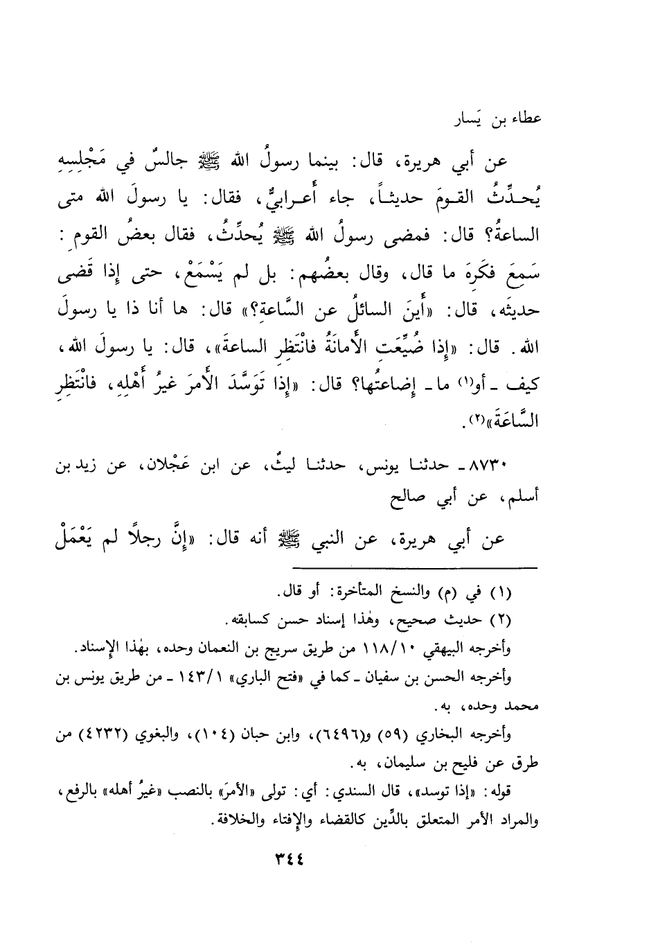 عَطَاءِ بْنِ يَسَارٍ، عَنْ أَبِي هُرَيْرَةَ، قَالَ: بَيْنَمَا رَسُولُ اللهِ صَلَّى اللهُ عَلَيْهِ وَسَلَّمَ جَالِسٌ فِي مَجْلِسِهِ يُحَدِّثُ الْقَوْمَ حَدِيثًا، جَاءَ أَعْرَابِيٌّ، فَقَالَ: يَا رَسُولَ اللهِ، مَتَى السَّاعَةُ؟ قَالَ: فَمَضَى رَسُولُ اللهِ صَلَّى اللهُ عَلَيْهِ وَسَلَّمَ يُحَدِّثُ، فَقَالَ بَعْضُ الْقَوْمِ: سَمِعَ فَكَرِهَ مَا قَالَ، وَقَالَ بَعْضُهُمْ: بَلْ لَمْ يَسْمَعْ حَتَّى إِذَا قَضَى حَدِيثَهُ، قَالَ: " أَيْنَ السَّائِلُ عَنِ السَّاعَةِ؟ " قَالَ: هَا أَنَا ذَا، يَا رَسُولَ اللهِ، قَالَ: " إِذَا ضُيِّعَتِ الْأَمَانَةُ، فَانْتَظِرِ السَّاعَةَ "، قَالَ: يَا رَسُولَ اللهِ، كَيْفَ؟ أَوْ (١) مَا إِضَاعَتُهَا؟ قَالَ: " إِذَا تَوَسَّدَ الْأَمْرَ غَيْرُ أَهْلِهِ، فَانْتَظِرِ السَّاعَةَ " (٢)